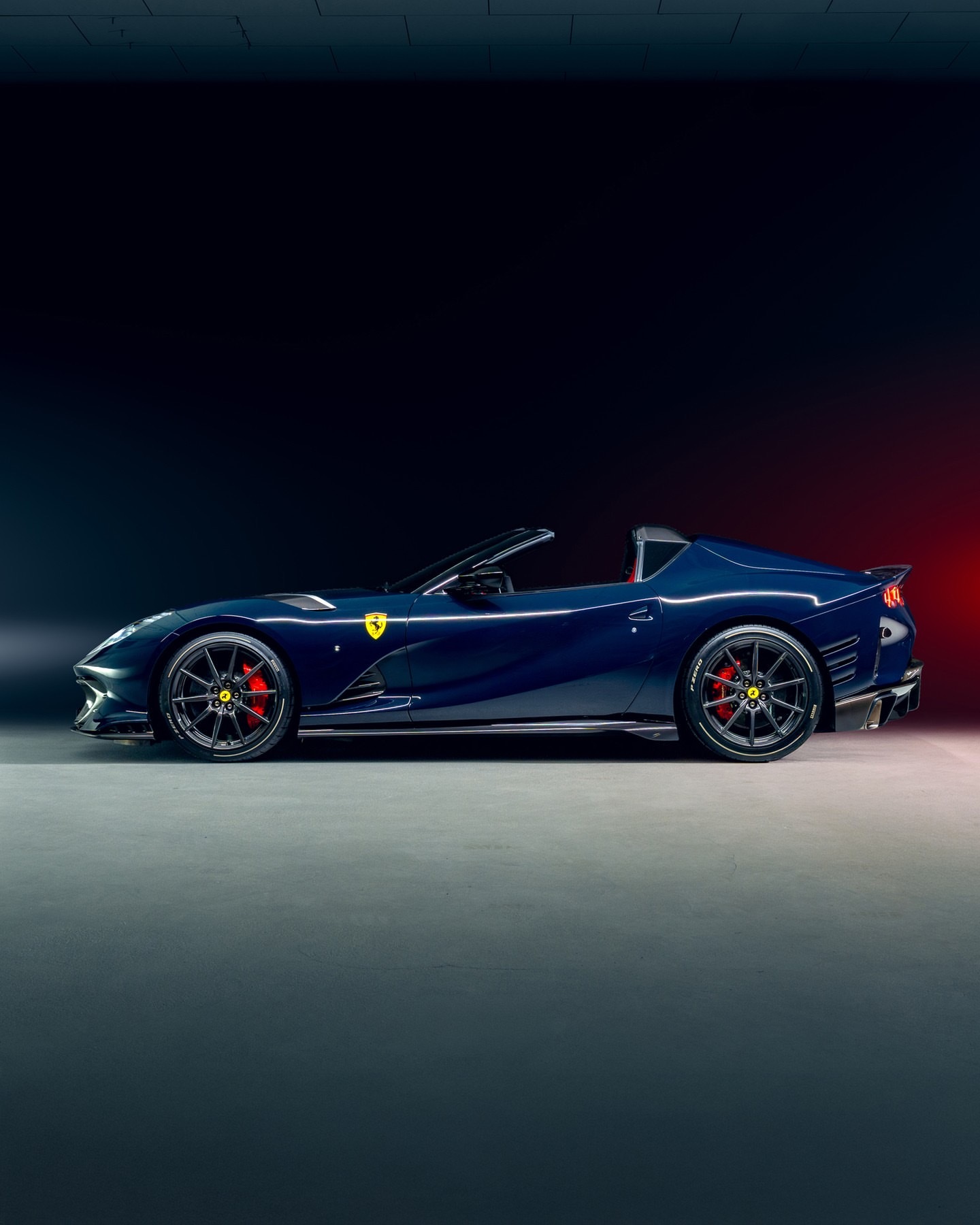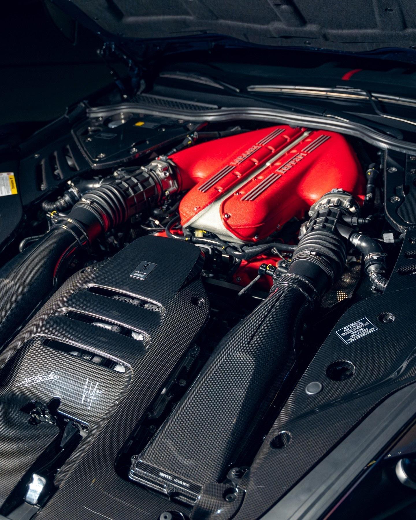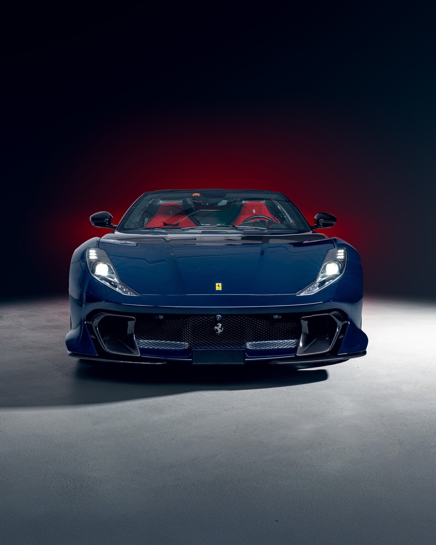 来自《速度定制收藏》的这个例子,以深邃的蓝波兹齐色搭配银色纽博格林装饰、空气刷漆的盾牌和全车碳纤维材质完成。引擎盖下,碳纤维发动机盖承载着法拉利一级方程式车手查尔斯·勒克莱尔和卡洛斯·赛恩兹的银色签名。