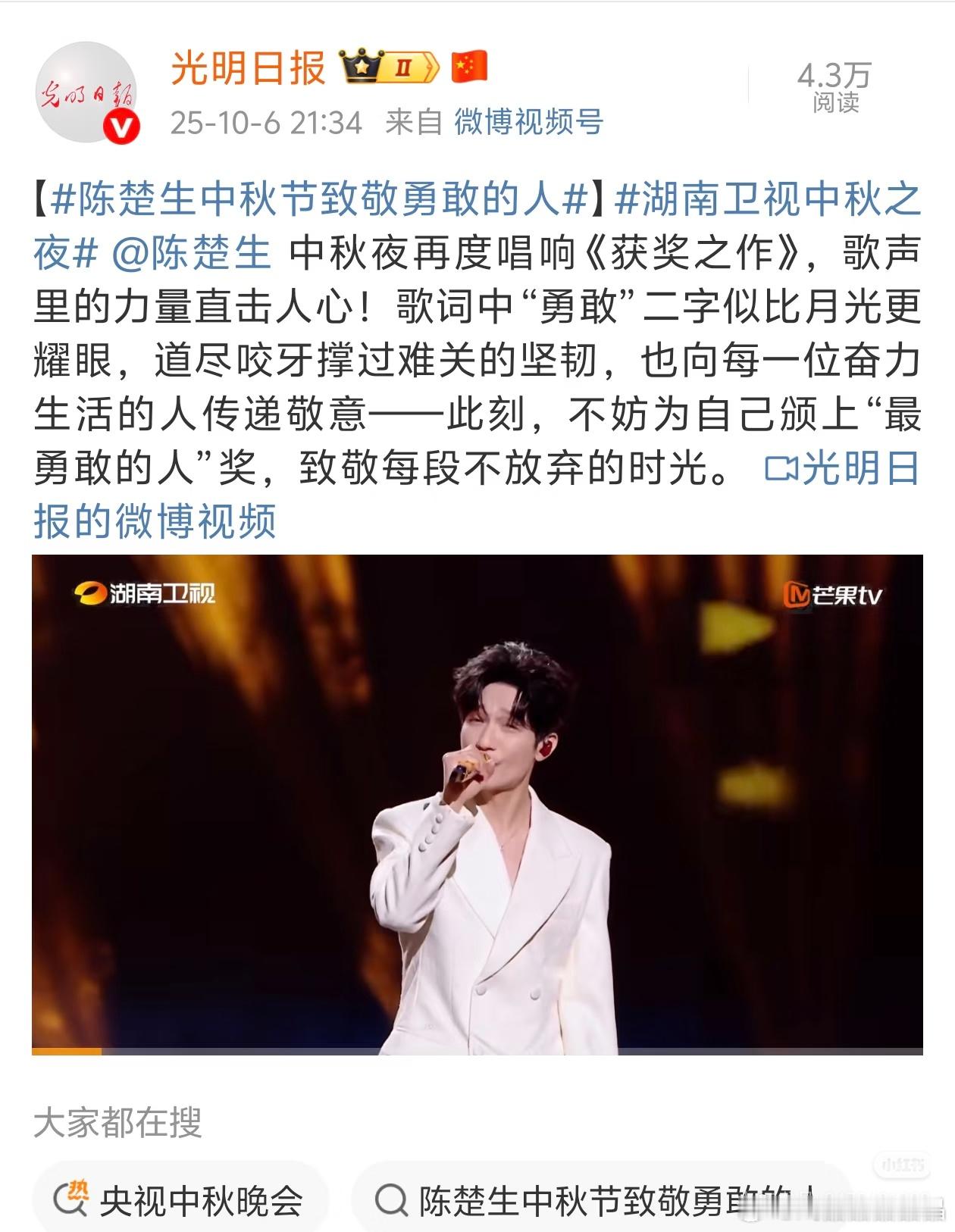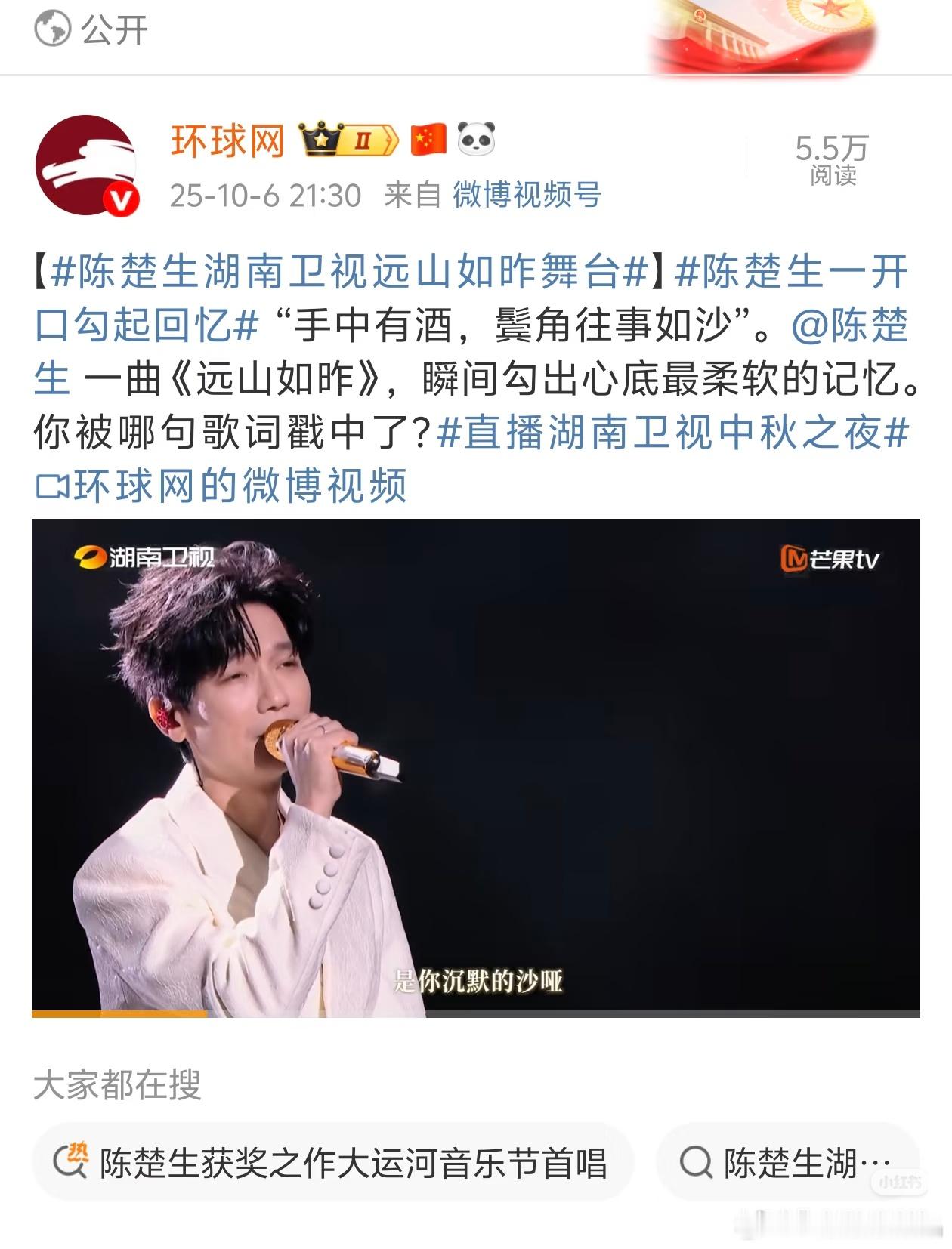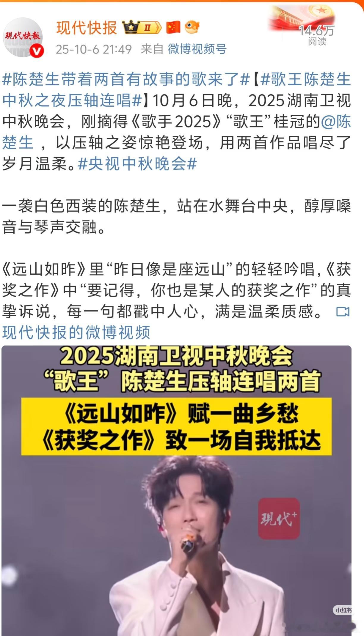陈楚生在湖南卫视中秋晚会演唱了两首歌曲,好多官媒都报道了![鼓掌][鼓掌][鼓掌]