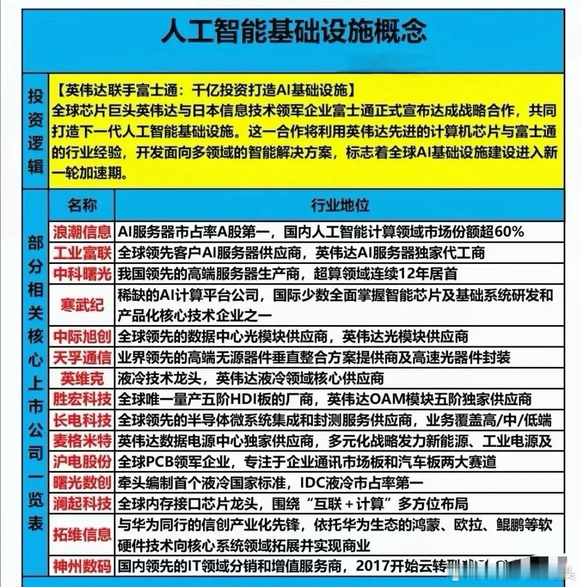 投资逻辑:英伟达与富士通合作打造下一代AI基础设施,全球AI基建进入加速期,涉及服务器、芯片、光模块、液冷、PCB等关键环节。