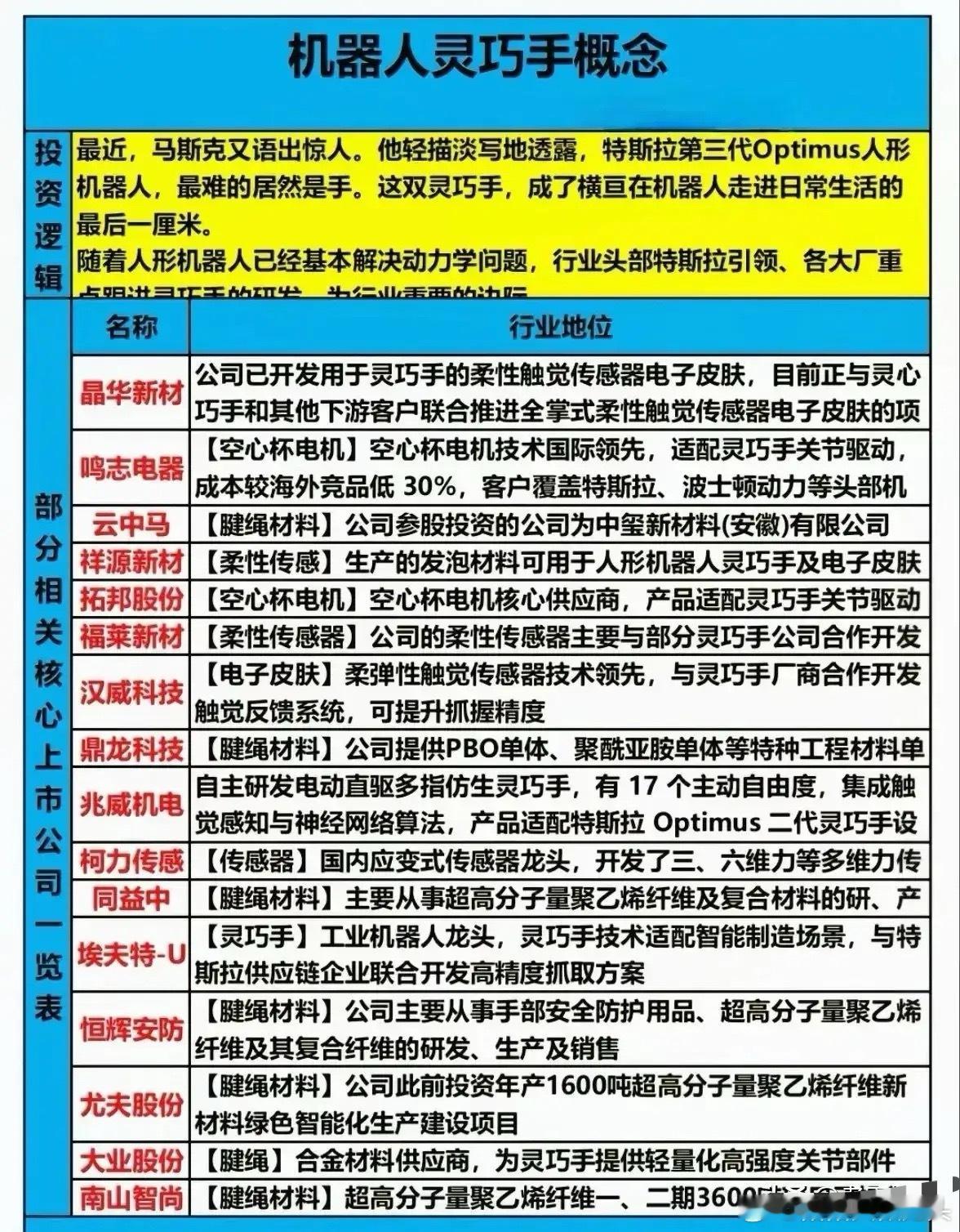 - 柯力传感(多维力传感器)、同益中、恒辉安防、大业股份、南山智尚、尤夫股份、鼎龙科技、埃夫特-U等(腱绳/材料/传感器)