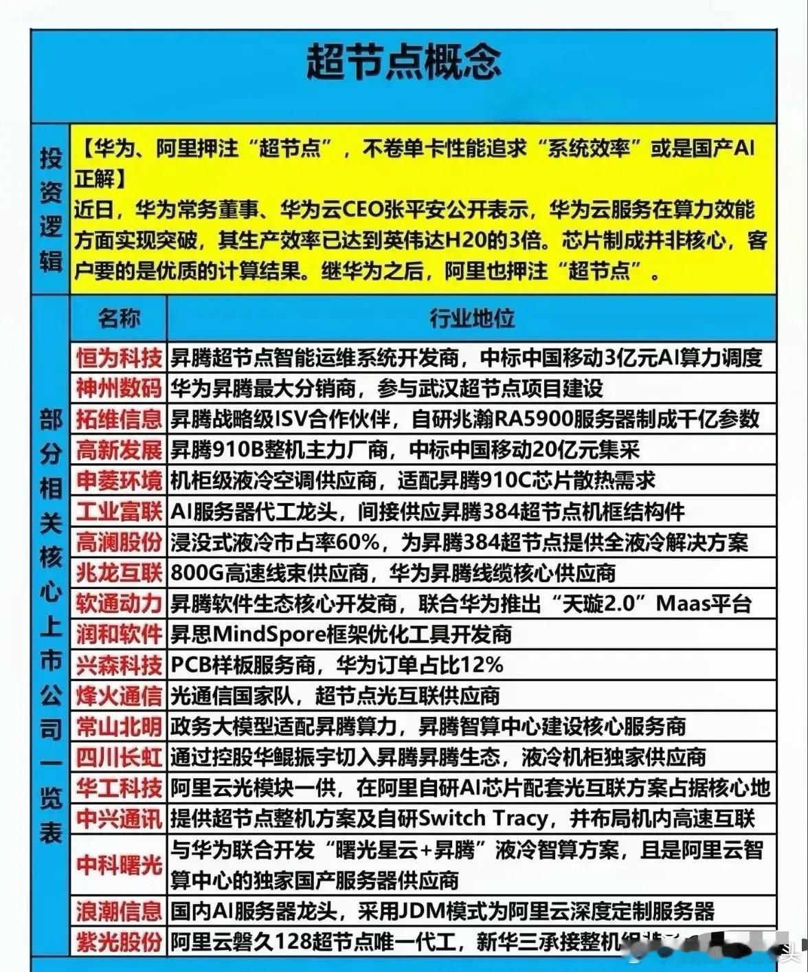 投资逻辑:华为、阿里押注“超节点”架构,不卷单卡性能,而是提升整体系统效率,华为云算力已达英伟达H20的3倍。