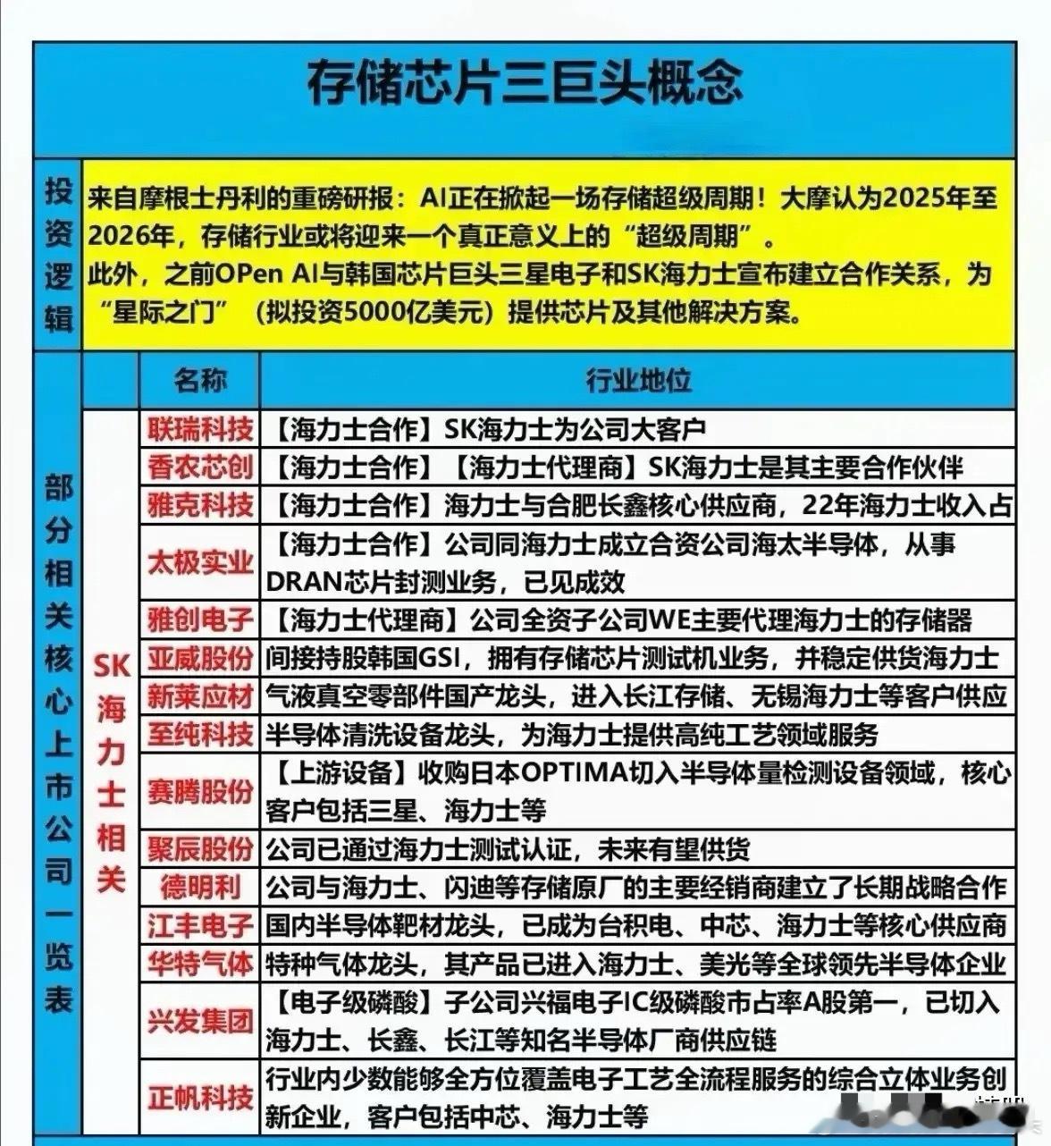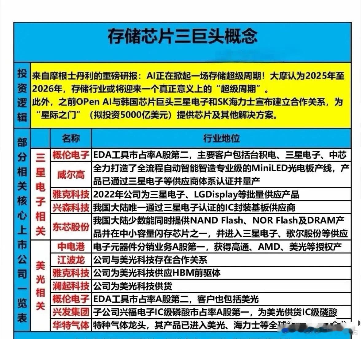 投资逻辑:摩根士丹利预测2025-2026年存储行业将迎“超级周期”,Open AI与三星、SK海力士合作,拟投资5000亿美元打造“星际之门”。