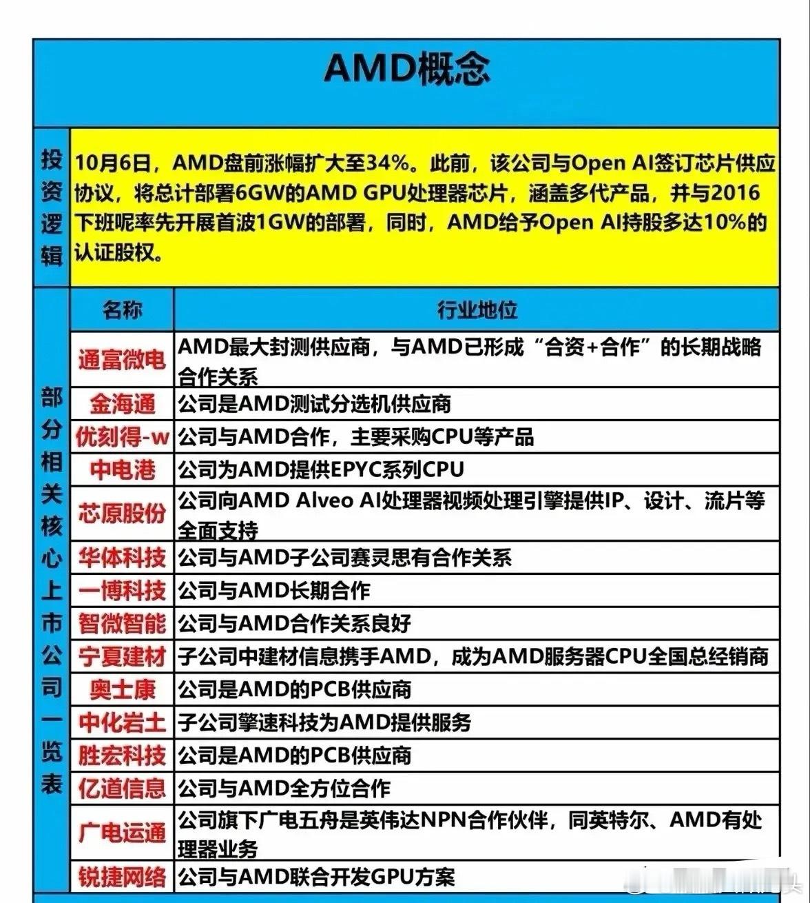 投资逻辑:10月6日AMD盘前大涨34%,因其与Open AI达成芯片供应协议,部署6GW AMD GPU,首波1GW,并授予10%股权。
