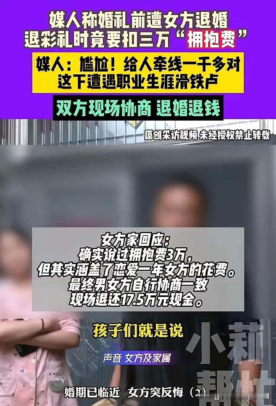 河南平顶山,相处一年,女子在婚礼前两个月突然提出退婚,此前男友家已给了她20万结婚费用。然而,女子只愿退回17万,声称要扣下3万作为“拥抱费”。 媒人找来记者,气愤不已地说:“我退休后做了十年媒人,头一回碰到这种事。我觉得这事儿简直不是人干的。到现在女方一分钱都没给男方退。” 这场荒唐的“拥抱费”闹剧背后藏着更扎心的真相。记者调查发现,所谓的拥抱发生在婚纱照拍摄现场——摄影师为营造甜蜜氛围让两人短暂相拥,这个职业性动作竟被女方标上三万高价。更讽刺的是,男方母亲回忆,姑娘去年中秋还主动给二老夹菜盛汤,那些亲密接触当时都被看作孝顺表现,如今全成了索赔筹码。街坊邻居透露,女方家最近给儿子买了婚房可能面临资金压力,退婚时机恰好卡在男方置办完所有婚宴事宜后。 从法律角度看,这场纠纷简直像法盲的即兴表演。根据2024年2月生效的最高法院涉彩礼纠纷新规,未办理结婚登记的情况下彩礼应当全额返还,所谓“拥抱费”在法律上根本不存在任何依据。哪怕按传统习俗,也从未见过把肢体接触明码标价的先例。那位奔波调解的老媒人气得直跺脚:“我促成过上千对姻缘,第一次见到把人情当成生意账本算的!” 值得玩味的是女方家理直气壮的态度。当记者追问扣除三万元的具体构成时,女方家长竟搬出“精神损失费”“名誉补偿费”等虚构名目,甚至声称“女儿被抱过就贬值了”。这种物化女性的逻辑,恰恰暴露了某些家庭一面喊着男女平等,一面又把女儿当作待价而沽商品的矛盾心态。附近超市老板偷偷告诉记者,这姑娘原本在县城打工挺开朗,订婚后被父母强行叫回家“保持矜持”,半年里性格都变阴郁了。 更深层的问题在于婚恋市场中的诚信危机。类似事件在河南农村地区并非个例,有律师透露去年处理过七起退婚彩礼纠纷,其中三起都存在巧立名目克扣钱财的情况。部分家庭把订婚当成风险投资,一旦婚约解除就千方百计保全“收益”。这种短视行为最终拉高整个地区的婚恋成本——现在平顶山有些媒人说亲时,会特意让双方签婚前协议明确退款细则。 不过极端案例不能代表社会全貌。同在平顶山的李女士分享自家经历:儿子前年退婚后,女方主动退还彩礼还多付了两个月利息,理由是“耽误小伙子青春该补偿”。这种将心比心的处理方式,才应该是婚恋纠纷的正常解法。毕竟感情不是买卖,算得太精容易赔上信誉,以后谁还敢和精于算计的家庭结亲? 各位读者你们怎么看?欢迎在评论区讨论。