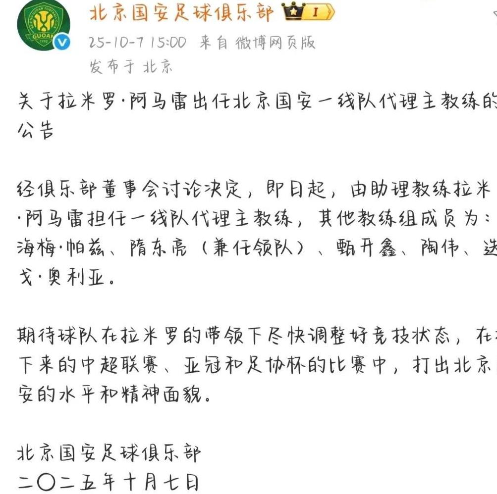 塞蒂恩今日告别状态良好!下午俱乐部官宣临时主教练! 北京国安俱乐部结束休假,今日下午继续在聚加训练。俱乐部在解约塞蒂恩后,官宣了原助理教练拉米罗接替塞蒂恩为临时主教练,拉米罗这位原中国沙滩足球主教练,本赛季追随塞蒂恩加入北京国安队教练组,过去的训练中也是一直带队,非常熟悉球队情况,相比塞蒂恩更加年轻富有激情 ,他带队的第一堂训练课也将在今天下午进行!
