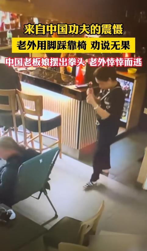 近日,一外国男子在中国老板娘开的店铺里,肆无忌惮的用脚踩在躺椅上,老板娘多次劝说老外无果后,直接双手握拳摆出功夫的姿势,老外看到这一幕当场吓得从椅子上跳起来,飞快逃离了店铺!网友:果然中国功夫才是最“好使”的。 王女士(化名)和丈夫经营的“隅间咖啡”,藏在城市老街的转角,原本是一处让熟客偷得浮生半日闲的安静所在,可自从进入国庆假期,这小店竟意外地迎来了一场国际化的“客流风暴”。 巨大的客流差异在清晨开门时就显现出来,除了操着各地口音的国内游客循着导航找来,金发碧眼的欧美背包客、步履匆匆的日韩青年也成了常客。 一时间,不足五十平米的空间里,飘荡着世界各地的语言。王女士的丈夫在咖啡机后几乎寸步不离,机器蒸汽的嘶鸣声从未间断,他手法娴熟地同时处理着三四个订单。 夫妻俩看着满座的桌椅和堆叠如山的杯碟,虽然累得几乎说不出话,终于那天,店里没有什么人,夫妻俩也能清闲一会,王女士将自己的专属摇椅给拿了出来,想着躺一会。 没一会进来了一位客人点了单子,王女士起身去给客人做咖啡,这时,一位身形高大的外国男士推门而入。 他没有去看菜单,而是径直走向窗边那张供店主休憩的私人躺椅,那是王女士丈夫偶尔小憩的角落。 王女士的丈夫正在操作咖啡机,眼角的余光瞥见了这一幕,眉头立刻蹙紧,只见那名男子竟毫不在意地抬起脚,那双沾着街尘的运动鞋底,眼看就要肆无忌惮地踩上凳子上。 王女士第一时间注意到了丈夫的眼神,立刻放下手中的活儿,快步上前,用手指了指椅子,用清晰缓慢的英语解释,不要踩自己的凳子, 但是那名男顾客只是斜瞥了她一眼,从鼻腔里发出一声含糊的轻哼,非但没有收回脚,反而身体一沉,将全身的重量都踏了上去! 就在那一刹那,王女士整个人的气场变了,一直挂在脸上的温和笑容瞬间敛去,眼神骤然锐利如刀,她没有再浪费任何口舌,而是将正在录制的手机稳稳放在身旁的桌子上。 接着,她双臂猛地一振,利落地将宽松的针织开衫向后甩开,双手紧握成拳,骨节发白,一前一后护在身前,双脚不丁不八地站定,一个标准的格斗预备姿势赫然成型。 刚才还气焰嚣张的男顾客,被这突如其来的气势震慑得浑身一僵。他看着王女士那绝非虚张声势的眼神和姿态。 脸上的嚣张瞬间被惊恐取代,几乎是手脚并用地从躺椅上弹了起来,踉跄着倒退几步,然后头也不回地仓皇推门逃走,消失在街角。 店内外瞬间安静下来,只剩下咖啡机还在低声嗡鸣,王女士缓缓收起架势,掸了掸衣服,仿佛刚才只是拂去了一粒微尘。 有网友看到这个视频后说道:干的漂亮,不能因为他是外国人就惯着他! 信息来源:余江融媒体