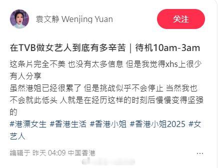 袁文静在影片下留言:“这片完全不美,也没有太多资讯,但我觉得xhs(小红书)上很少人分享,虽然港姐已经很累了,但是挑战似乎不会停止,当然我也不会就此低头,人就是在经历这样的时刻后慢慢变得坚强的”,为自己打气。