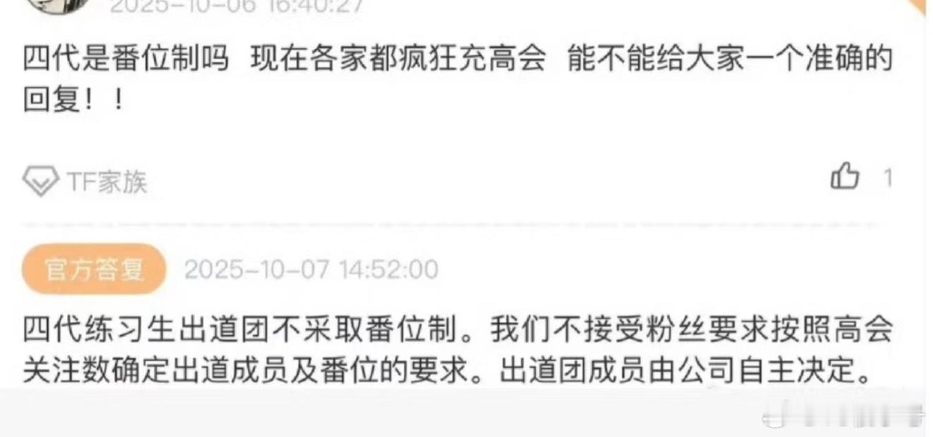 TF四代出道团成员由公司自主决定TF四代出道不采取番位制,公司意思就是:钱我是要