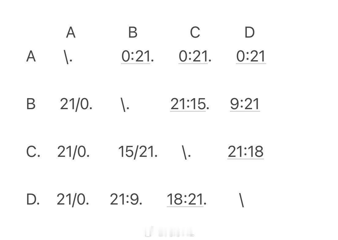 今天参加天津市的匹克球比赛,A退赛了,按净胜分应该是D组第一出线没毛病吧?(我们是D组),结果给我们算的小组第三,白等了三个小时…也没打上,挺无语的,跟我们说系统就是这么算的…