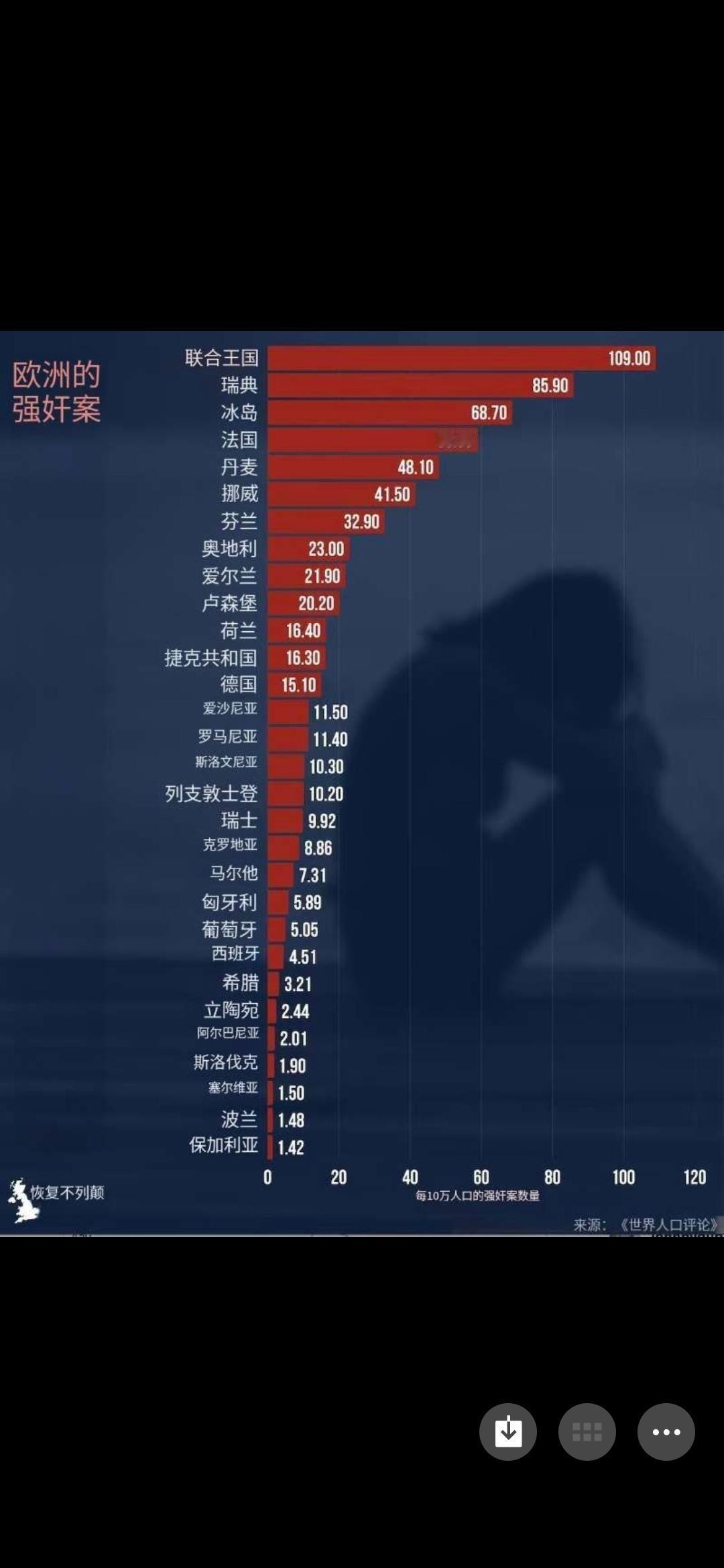 看到一个有趣的统计,是欧洲各国每10万人的强奸案数量。 可以看到,在欧洲各国中