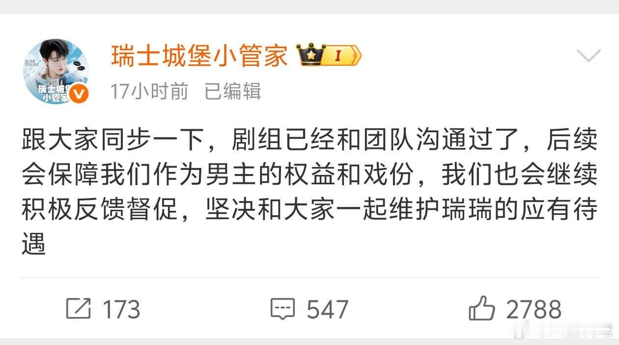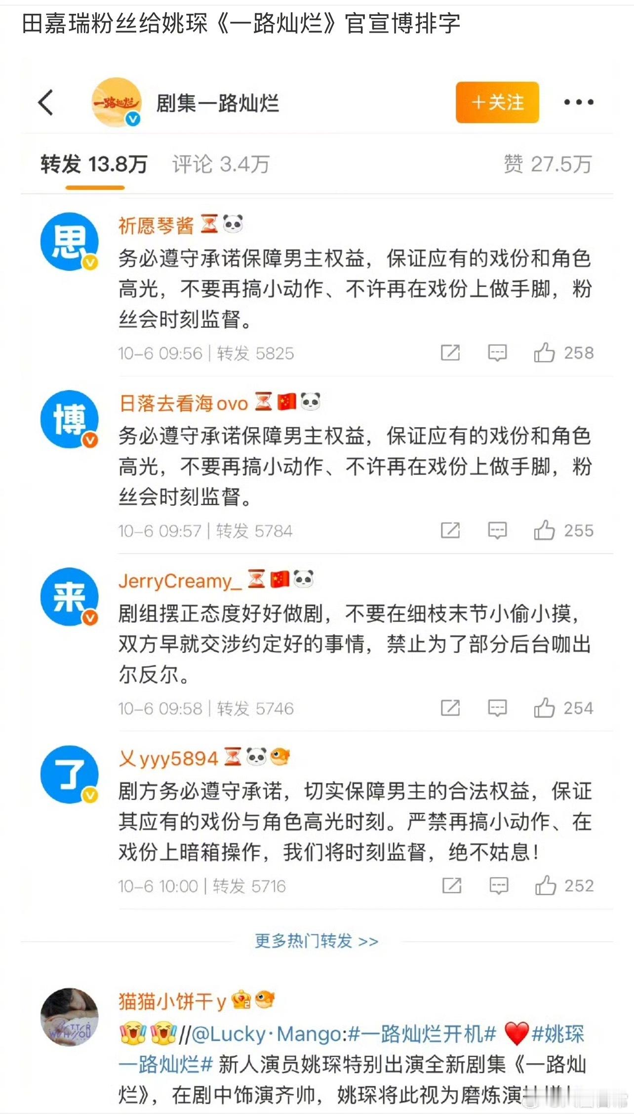 田嘉瑞粉丝维权成功,《一路灿烂》剧组跟田嘉瑞团队沟通过了,后续会保障田嘉瑞作为男主的权益和戏份