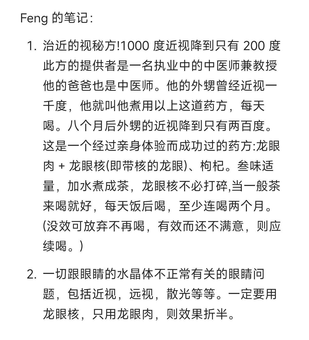 缓解眼睛疲劳,改善视力的茶饮分享,龙眼肉+龙眼核(即带核的龙眼)、枸杞。叁味适量,加水煮成茶,龙眼核不必打碎,当一般茶来喝就好,每天饭后喝,至少连喝两个月。近视[超话]健康养生