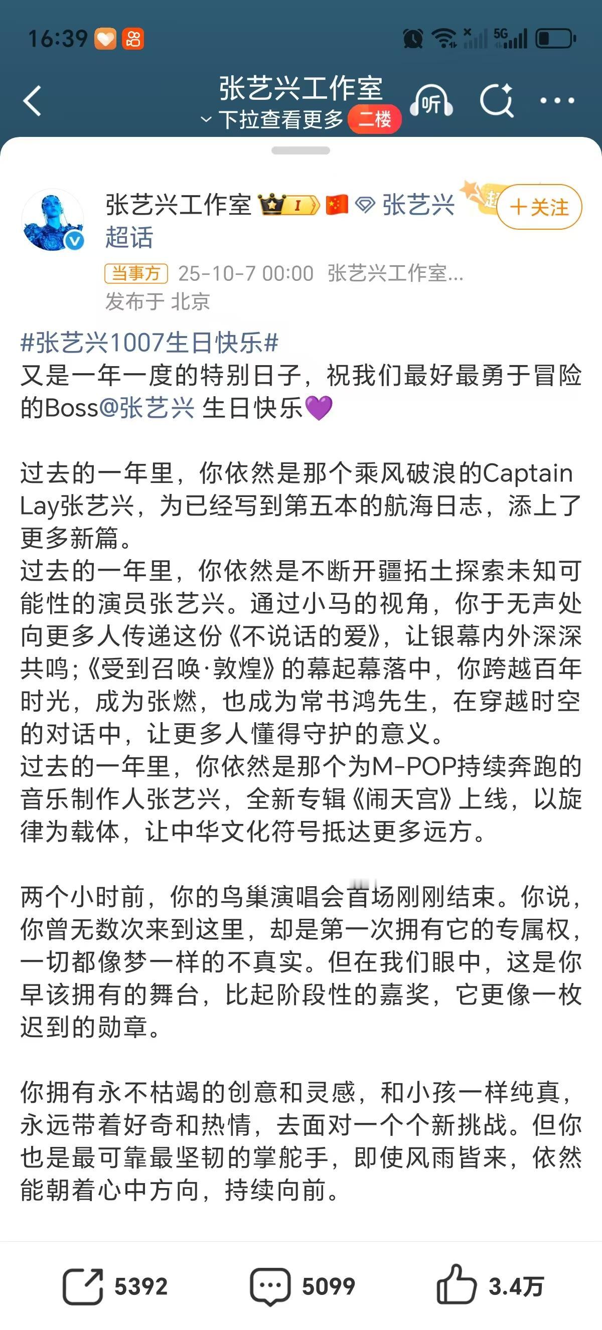 张艺兴工作室发长文祝他生日快乐 又是一年一度的特别的日子,祝我们最好最勇的的张艺兴生日快乐。 10月6号,张艺兴演唱会北京站开唱,总导演张艺谋,开场太震撼了,我2008年北京奥运会开幕式差不多,舞台灯光编排全是大片即视感,张艺博导演出手就是不一样,这排场跟春晚有的一比。 这场演唱会,张艺兴也是倾尽所有,尽情表演,但是给自己7号的生日最好的一个祝福。 祝福张艺兴34岁生日快乐,祝福你越来越好,我的老乡。张艺兴 张艺兴演唱会