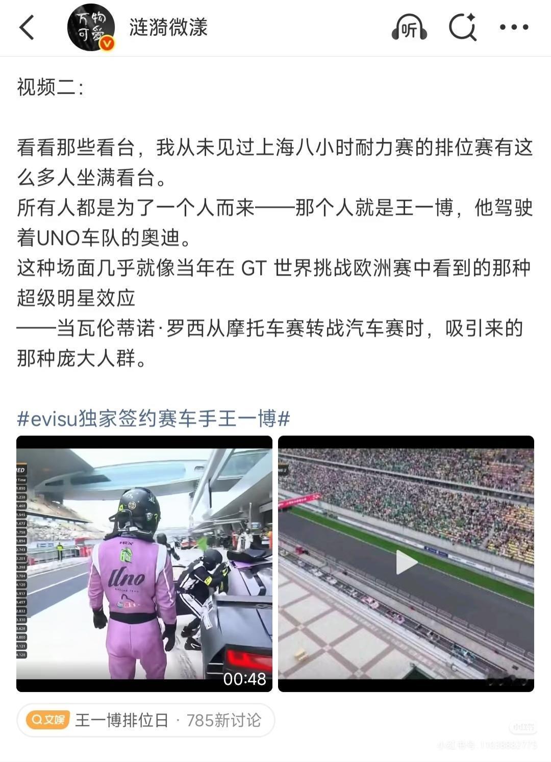 看油管解说如何盛赞85号赛车手王一博: “超级明星——王一博”; “你可以说,他是华语世界的代表人物”; “我觉得他的粉丝可以和猫王埃尔维斯·普雷斯利的追随者相比”; “他确实是一个非常有才华的人”; “我从未见过上海八小时耐力赛的排位赛有这么多人坐满看台”; “所有人都是为了一个人而来——那个人就是王一博”。 甚至将王一博引爆的这种超级明星效应比作当年王一博的“偶像”瓦伦蒂诺·罗西从摩托车赛转战汽车赛时,吸引来的那种庞大人群。 王一博[赞][大金牙]。 王一博