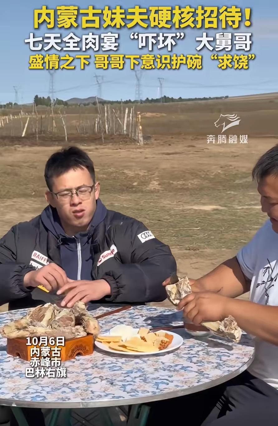 内蒙古赤峰这事儿太逗了!一男子放假去看远嫁的妹妹,结果被妹夫的“硬核招待”整 懵了—— 七天顿顿全是肉,最后见着肉就摇头盖碗,网友都笑说下次怕是不敢来了 头两天手把肉、烤羊排轮着上,他还直夸内蒙牛羊肉香,可到第三天就扛不住了,顿顿硬菜把肠胃给整“罢工”,加上还感冒,简直吃肉吃到怕。 妹妹是山西人远嫁内蒙,妹夫是地道蒙古族,在草原上,招待客人就得用最实在的法子:把肉管够,吃到饱吃到满足,这可是最高礼节 网友调侃说,本来是考察妹妹生活,结果天天吃肉吃到脑壳晕,也有人说山西人习惯面食荤素搭,突然切换全肉模式,可不就“水土不服”嘛。 但你别说,这种“吃怕了”的热情,反而比啥都让人记牢。大舅哥嘴上喊着再也不来,心里门儿清,这种把你当自家人的待遇,可不是随便谁都能享着的 有时候热情“过了头”才好,这股子实在劲儿,能让人记一辈子。你要是遇到这种“硬核招待”