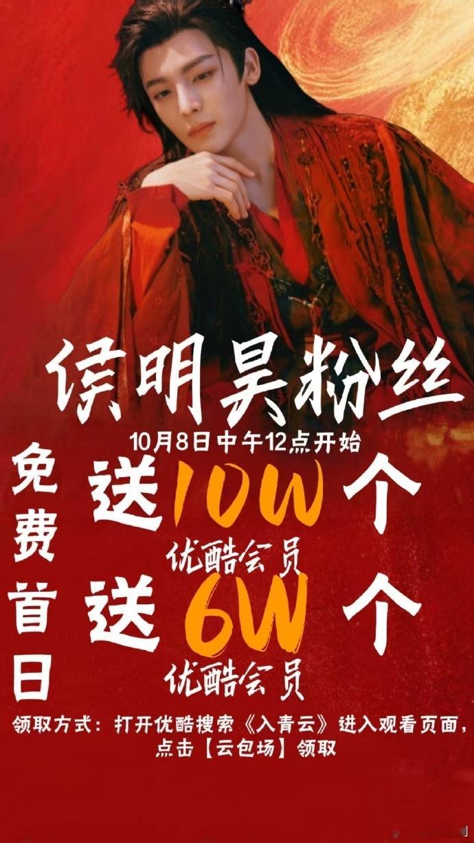 侯明昊《入青云》明日中午12:00开播,侯明昊粉丝准备好了10万+☁️包场,期待🥰