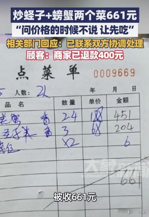 广东惠州这家馆子火了,“海鲜刺客”一个炒蛏子和螃蟹居然要661,以后大家去惠州旅游,记得先问清楚,不然得吃亏。 261就两菜,估计两个人还吃不饱吧;我们普通人还是吃点简单的,几个人都可以吃撑。 要是搁东北661得几个人吃呢?有没有东北人出来说两句。 惠州本地的去过那家吗?你们去也是一样吗? 有网友说退了就完事了吗?以后还会不会再出现这种情况呢? 大家怎么看呢?你们会去吃吗?