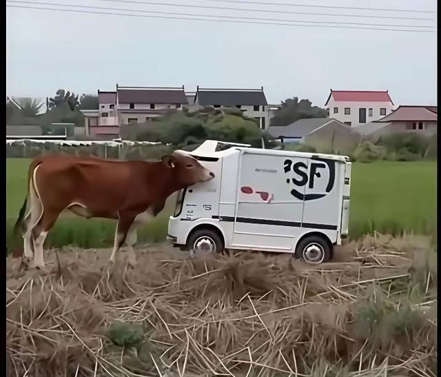 笑翻了无人快递车又惹事了…… 2025年无人快递车普及到乡村,由于在试点和推广,可总能闹出笑话。国庆回老家看到有趣的一目:无人快递车被导航引进田间小路和正在小路上行走牛犊相对,互不相让,被牛犊顶翻水塘里。网友:“主人都不在,各自负责”。 好奇的是它会自动导航、避障,还能把包裹准时送到你家门口。为什么这些技能遇上一只好奇心爆棚的牛,就跟武林高手被小孩绊了一下一样——技术全废。 在人工智能最自信的一秒,被动物界的原始力量直接终结,这场景要拿去拍科幻喜剧都不用改剧本。 这个场景从另一面看:既有趣又温馨画面!无人快递车按照导航走错路,误入田间小路,遇到正在小路上悠闲行走的牛犊,两者“互不相让”,形成了一幅生动的画面。网友调侃“两个主人都没在场”,幽默地表达了:无人车像是“自己跑偏”了,而牛犊则像“自然的主人”,在田野里自由自在地行走,似乎都在“争夺”这片空间。这样的生活小插曲,不仅让人会心一笑,也展现了科技与自然的有趣碰撞。