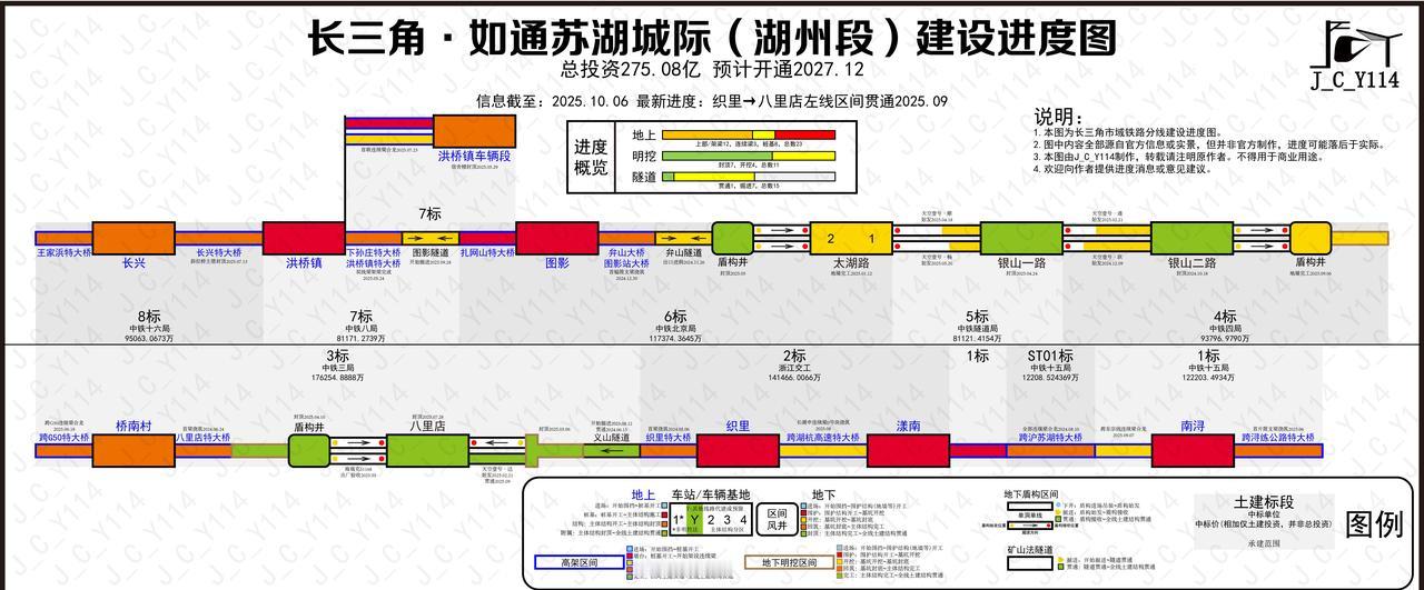 湖州段建设进度简报2025.09 总体情况: 这段时间进展还是非常快的,不过因为大量的高架区间而无法在进度图体现。1标似乎计划使用沪苏湖高铁的制梁场继续为如通苏湖城际制梁,目前已设置施工便道和起重场地。2标制梁场已完成首榀梁预制,连续梁也开工。首个盾构区间已贯通,最后开工的明挖段也完成了地下连续墙施工。长兴特大桥的现浇简支梁施工进度已经过半。希望之后能保持进度,尽早实现主体结构贯通。 施工情况: 1标跨东宗线连续梁合龙 2标跨长湖申线连续梁0号块浇筑 2标首榀预制梁生产成功 织里→八里店左线区间贯通 八里店站主体结构封顶 桥南村~银山二路区间明挖段地下连续墙完工