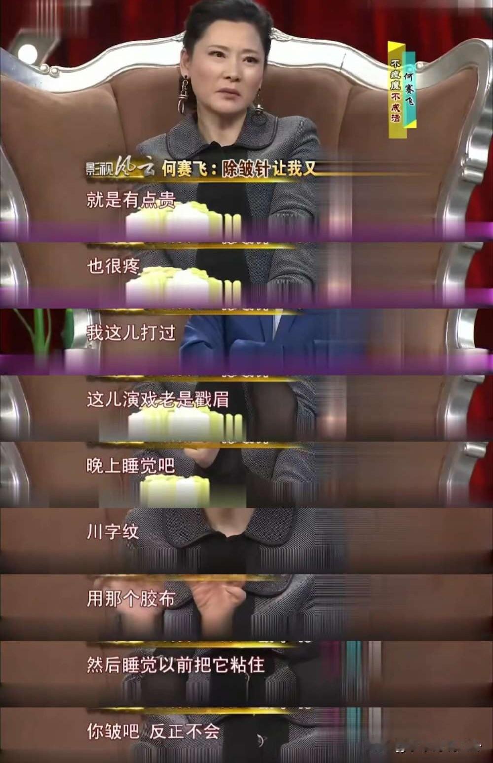 何赛飞说:“打除皱针好是好,就是太贵,也很疼。我眉心这里打过,因为我演戏的时候这里老是皱眉,有川字纹,然后我就睡觉前用胶布粘住,心想你皱吧,还挺管用的,但是早晨撕开了以后它有黏糊糊的东西,我觉得不舒服,后来知道可以打针,就去打了,太疼了,而且很贵,还是算了吧!”何赛飞说做医美前提一定是要安全,要是磨骨之类的,那还是算了,稍微拉个皮,她觉得可以接受。何赛飞觉得演戏需要脸型各种各样的演员,不要搞得大家一样,但她也能理解整容,因为漂亮的话,成功的几率比较高。而且她还觉得不仅演员可以做医美,其他人也可以,只要有钱能忍痛而且安全的话,那就去做好了,关别人什么事呢?