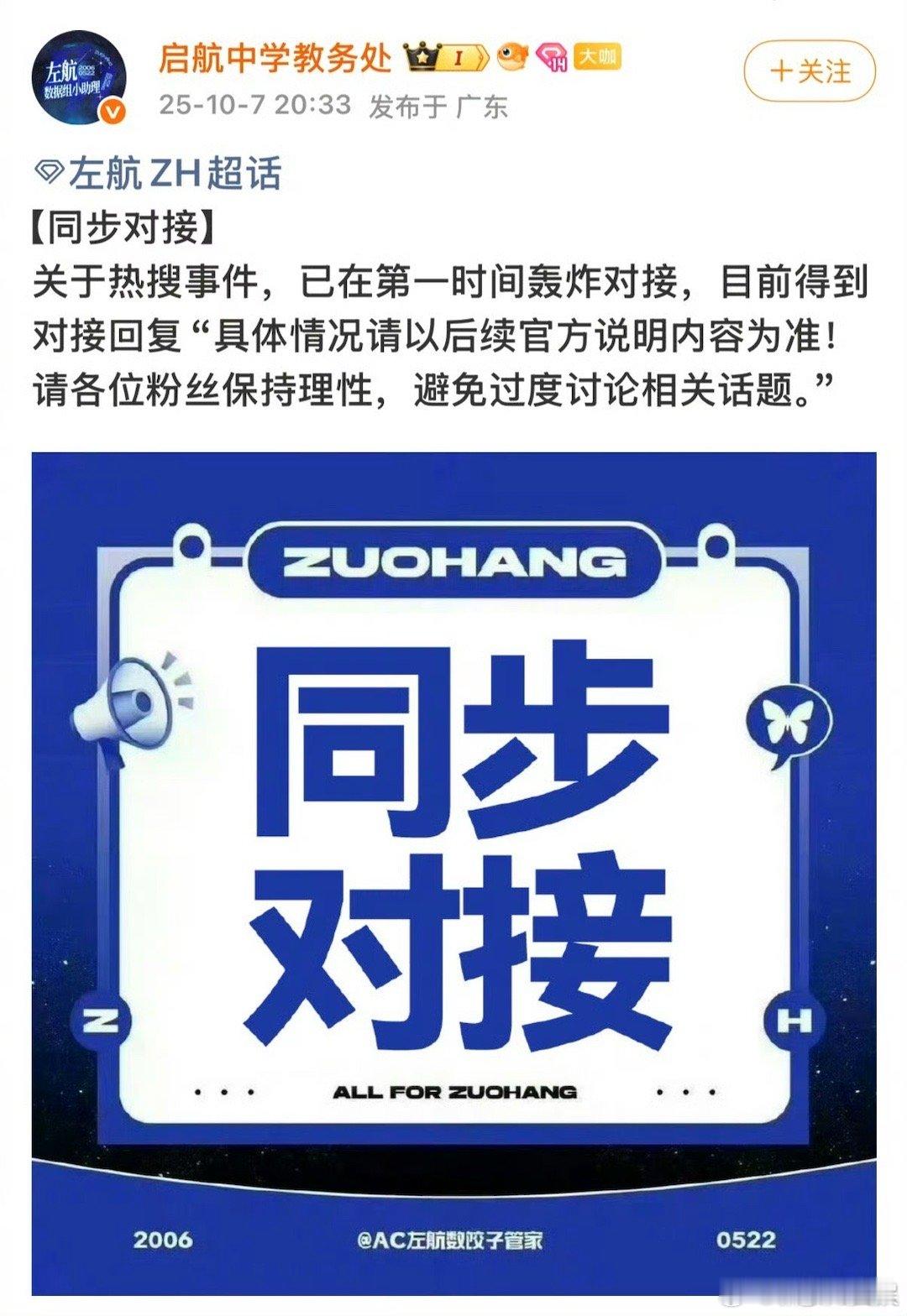 对接回应左航撞人 对接回应左航 撞人:“具体情况请以后续官方说明内容为准!请各位粉丝保持理性,避免过度讨论相关话题。”