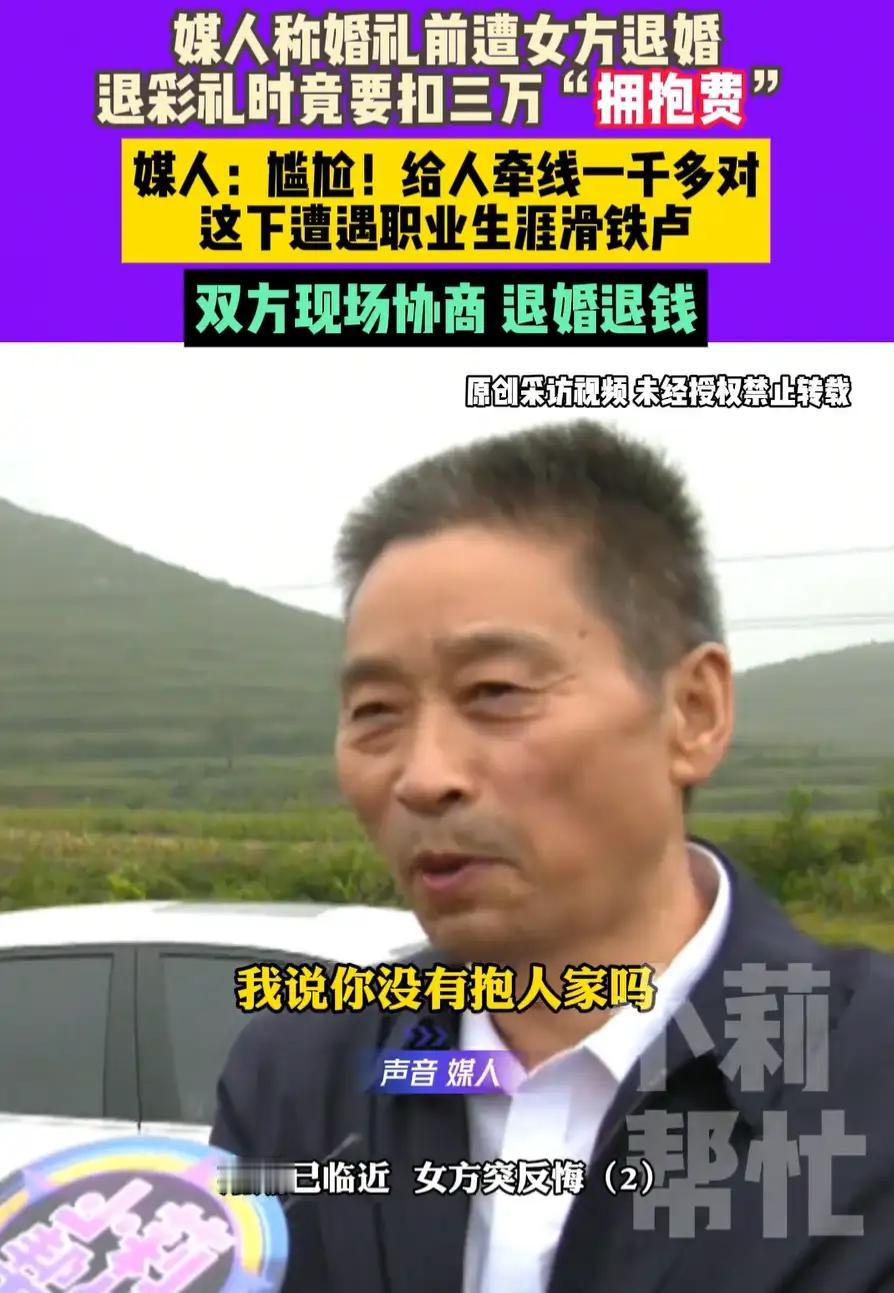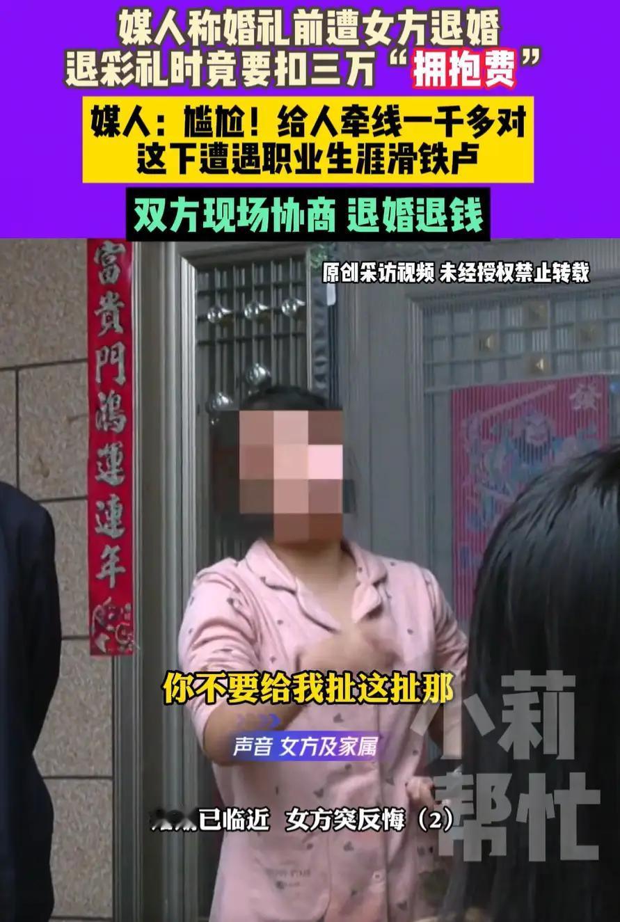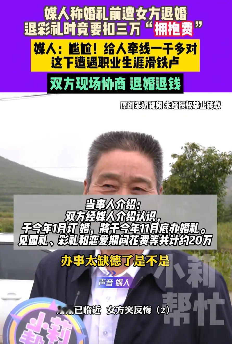 “万万没想到”!河南平顶山,男子经媒人介绍,认识了一名女友,两人很快就订了婚,男子也是买了金首饰,给了彩礼,可临近婚礼一个月,女方突然要退婚,彩礼倒是能退,但要扣掉3万元“拥抱费”的,79岁的媒人都无语了:说了一辈子媒,第一次遇到这样的! 媒人王大娘受男方小李家所托,给28岁的小李介绍对象。没几天,她就将邻村的姑娘小张介绍给了小李认识。两人见面后互相有好感,加上双方家长催得紧,认识还不到两个月,就敲定了婚事,选好了10月份的婚期。 按照当地习俗,订婚时小李家一点没含糊:不仅花3万多买了金项链、金手镯和金戒指,还一次性给了小张家里12万8的彩礼。小张和家人当时满脸欢喜,连连答应会好好筹备婚礼,让小李放宽心。 眼看婚期越来越近,距离举办婚礼只剩一个月,小李正忙着联系酒店、发请柬,小张却突然带着母亲找上门,开口就说“这婚不结了”。小李和家人当场懵了,追问原因,小张只含糊说“性格不合,处不来了”。 好好的婚事说黄就黄,小李虽满心委屈,但也知道强扭的瓜不甜,只能同意退婚,唯一的要求就是返还彩礼和金首饰。小张母亲倒是没拒绝退彩礼,提出要从12万8的彩礼里扣掉3万块,理由是“两人处对象期间,我闺女跟他拥抱、牵手,这都是付出,得算‘拥抱费’”。 这话一出,小李气得差点跳起来,双方当场吵得不可开交。一旁的王大娘赶紧劝和,可无论她怎么说,小张家人都咬死要扣这3万块,还说“不给就别想拿回剩下的钱”。 “处对象哪有算这个钱的?”王大娘说:见过因彩礼闹矛盾的,却从没听过“拥抱费”这种说法。“当初双方都愿意处,现在说散就散,还拿这个当理由扣钱,实在不讲理!”