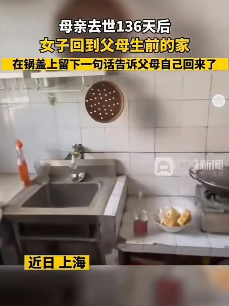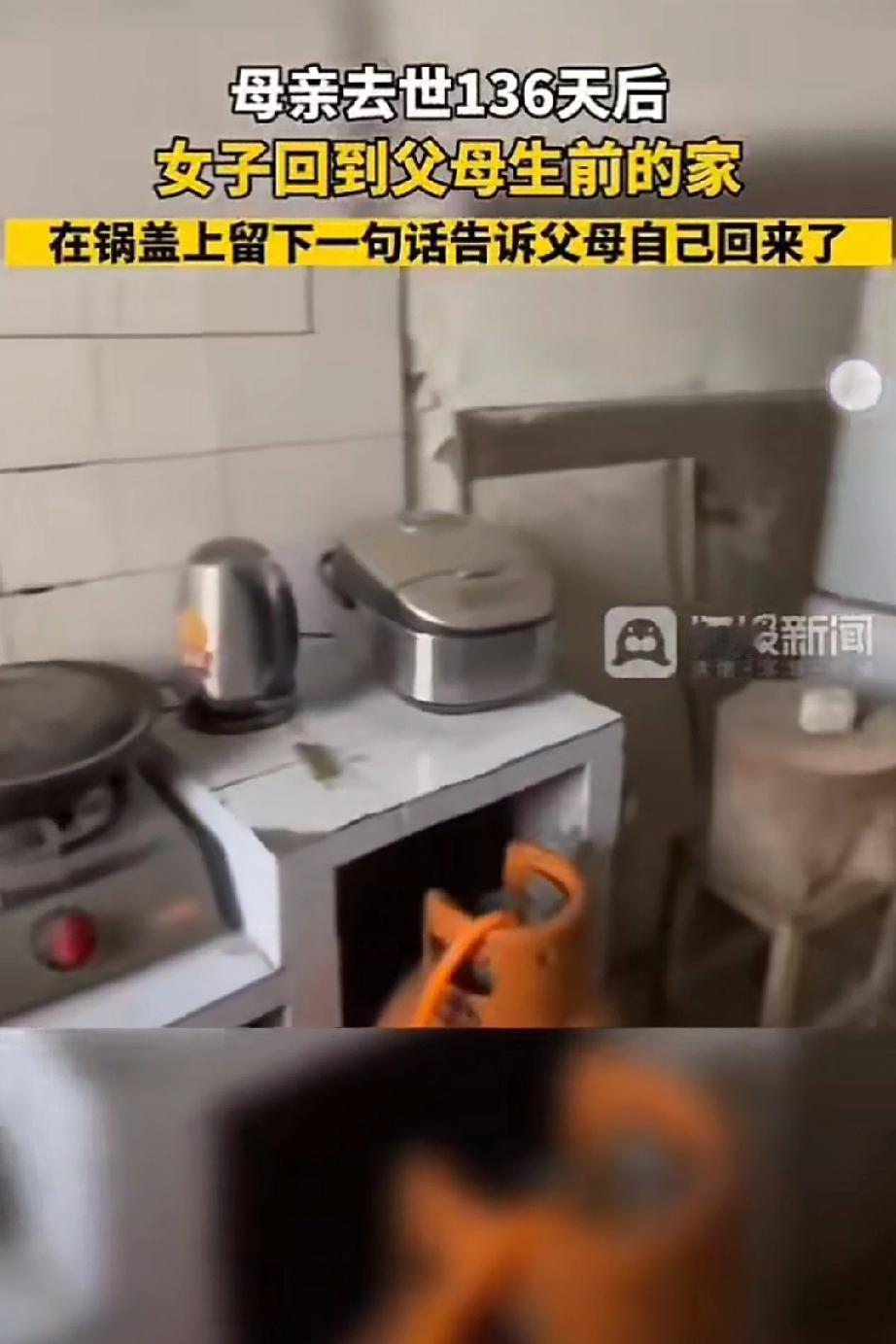 母亲去世136天后女子来到父母生前的家,迎入眼帘的是空荡荡的屋子布满灰尘的锅碗瓢盆,还有父母生前的影子,这里的一切仿佛又回到了父母在时的样子,再喊爸妈已无人应声,看着熟悉的厨房想起爸妈给她做过的每一顿饭,女子默默的流下了眼泪,于是,在满是灰尘的锅盖上写下了一句:爸妈我来过了!