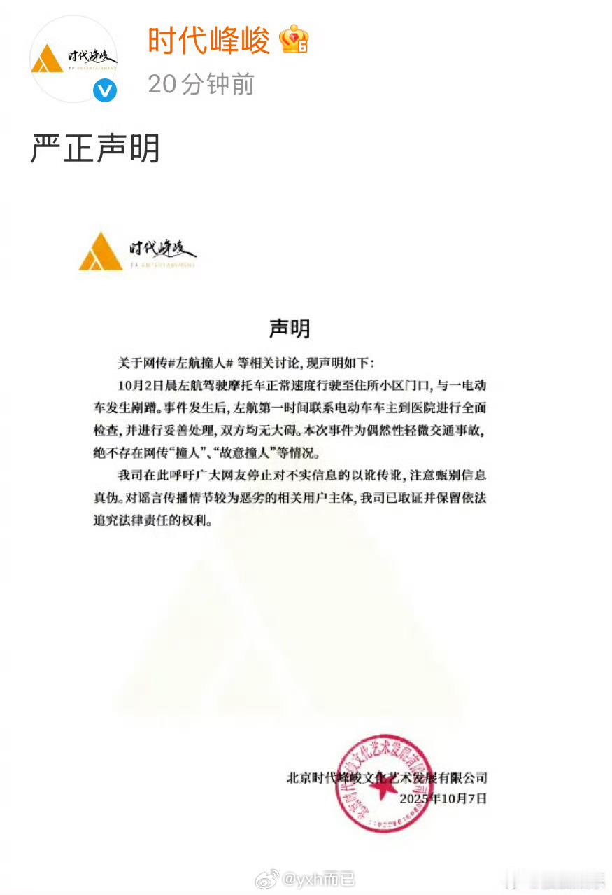 左航 撞人时代峰峻这公司官博一拉下来全是严正声明时代峰峻回应左航撞人