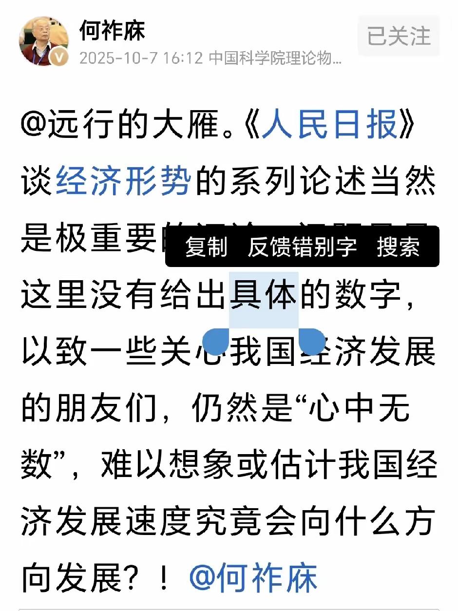 毫无例外,老何又怼上了中财委,中央财经委员会。上怼天下怼地中间怼空气,怼中国的一切,舔欧美的一切。只要是欧美的,好,很好,非常好,必须好。只要是中国的,差,很差,非常差。这就是老何的惯性思维,也是老何持之以恒的条件反射,也就是老何形成肌肉记忆的深刻记忆,这,已经融入了老何的血液里。 我为什么要说?因为他是那个军团的带头大哥,影响极坏,不说不足以平民愤。一如既往,持之以恒,一向如此,向来如此,如此而已! 老何谈中医只有10%的精华,倒是给出了数据,但这种张口就来的数据,不知有什么意义? 老何,何祚庥怨士,为什么对中央财经委员会有意见?为什么对中央财经委员会大放厥词?老何就埋伏在那里,对中国的一切横挑鼻子竖挑眼。反正,你做什么都是错的,反正,你怎么做都是错的。 国庆节期间,《人民日报》连续五天刊发钟才文(中央财经委员会文)署名文章称,“中共长期执政为中国经济发展提供稳定锚,不能因部分经营主体感受不好就否定整体经济形势”。有理有据,有条不紊,有的放矢,有板有眼,但是,老何却跳高,他声嘶力竭大言不惭大放厥词:“《人民日报》谈经济形势的系列论述当然是极重要的评论。问题是这里没有给出具体的数字,以致一些关心我国经济发展的朋友们,仍然是心中无数,难以想象或估计我国经济发展速度究竟会向什么方向发展?!” 我靠,一个所谓的物理学家,除了物理不懂,其他领域全懂,10处打锣九处在,什么事儿都要插上一脚,笑死人了。 事实上,中央财经委员会的文章虽然发表在《人民日报》,但这五篇文章是代表中央的精神的。代表中央的精神,老何,你听到了吗 老何倚老卖老,装着没有听见,总是对中央精神有意见?自己没有通读这五篇文章,就凭自己的主观意愿,就凭自己的肌肉记忆,就凭自己持之以恒的恨国思维,宣判!老何,你怎么知道没有具体的数字?我国的经济数据都是公开的,网上都可以查证。如果你老何需要了解哪方面的数据,完全可以让你的“狐朋狗友帮你查一下。 完全有可能,老何的那些关心我国经济发展的美国朋友、日本朋友、德国朋友们,特别是发明煮蛋器的德国朋友,一定掌握了这方面的数据。 感谢老何,给我们提供了一个活生生的典型例证,一个被思想殖民,被精神殖民的典型例证。