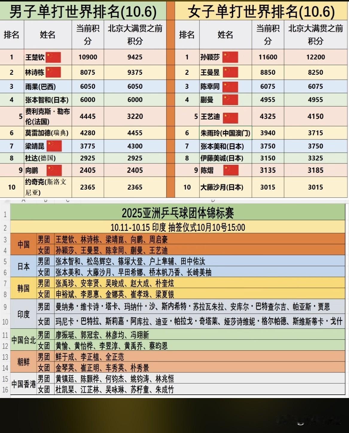 🏓男女单打最新世界排名🆕⬇️⬇️🔥🔥 10月7日,WTT官方公布2025年度第41周世界排名。国乒表现亮眼,男女单打都很出色。 男单王楚钦积分10900分破万,高居第1。林诗栋、雨果、张本智和排2到4位。F - 勒布伦上升2位到第5,莫雷加德和梁靖崑各降1位,向鹏排第9。小将陈俊菘飙升67位到第46名。 女单孙颖莎11600分稳坐第1,王曼昱8850分排第2,陈幸同、蒯曼、王艺迪分列3到5位,朱雨玲升至第6,陈熠排第9。国乒在乒乓球领域实力依旧强劲,未来值得期待! 国乒排名 乒乓球世界排名