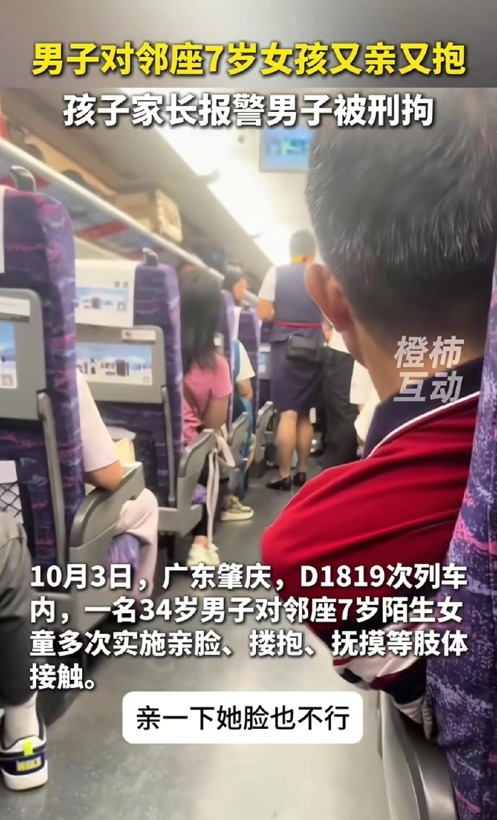 广东高铁上34岁余某辉, 在地铁上猥亵7岁小女孩, 最近结果出来了,余某辉已经被拘留了,希望严惩这样的人,给小女孩造成巨大的心理阴影。 事情发生在10月3号,有乘客作证,余某辉上车就开始摸小女孩后来又开始亲小女孩,开始大家以为是亲戚没有在意,后来发现不对劲。 小女孩和妈妈不是坐在一起的,小女孩妈妈知道后,当场就质问余某辉,男子否认自己猥亵,说女孩太可爱,自己老家那边就可以。 还好有路人支持小女孩妈妈,才没让坏人继续作恶,最后被乘警及时处理。 请问你老家哪里的?可以对一个陌生女孩又抱又亲,要不要去证实下,还好当时有乘客录了下来,证实的余某辉的罪名! 不要认为孩子还小没关系,怎么可能没有关系,就算是女性看到小孩太可爱,不认识也不能随便又亲又抱的! 这种人必要严肃处理,任何借口都不能成为他违法的理由,这样的人应该曝光他,让他的亲戚朋友都知道,直接告到他的单位,让所有人都知道他丑恶嘴脸! 有知情的网友还爆料出,他是一名博士,在广州某科技公司工作,老家湖南的。 所谓“太可爱”,绝不是侵犯的理由。高铁这幕让人心疼又警醒——孩子需要的不只是保护,更是社会对“边界”的清醒共识:任何亲昵,都该止于尊重。