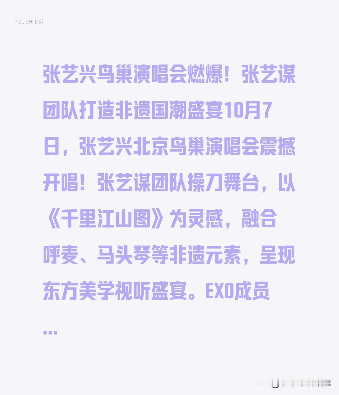 张艺兴鸟巢演唱会燃爆!张艺谋团队打造非遗国潮盛宴 10月7日,张艺兴北京鸟巢演唱会震撼开唱!张艺谋团队操刀舞台,以《千里江山图》为灵感,融合呼麦、马头琴等非遗元素,呈现东方美学视听盛宴。EXO成员SUHO惊喜登场,合唱未公开新歌引爆粉丝狂欢。“美猴王闹天宫”主题秀惊艳全场,皮影戏、川剧变脸等传统艺术轮番上演。抖音独家直播观看量破亿,张艺兴用实力证明:顶流偶像也能成为文化传播者!张艺兴