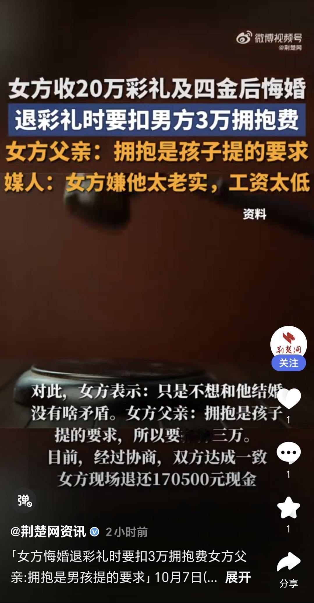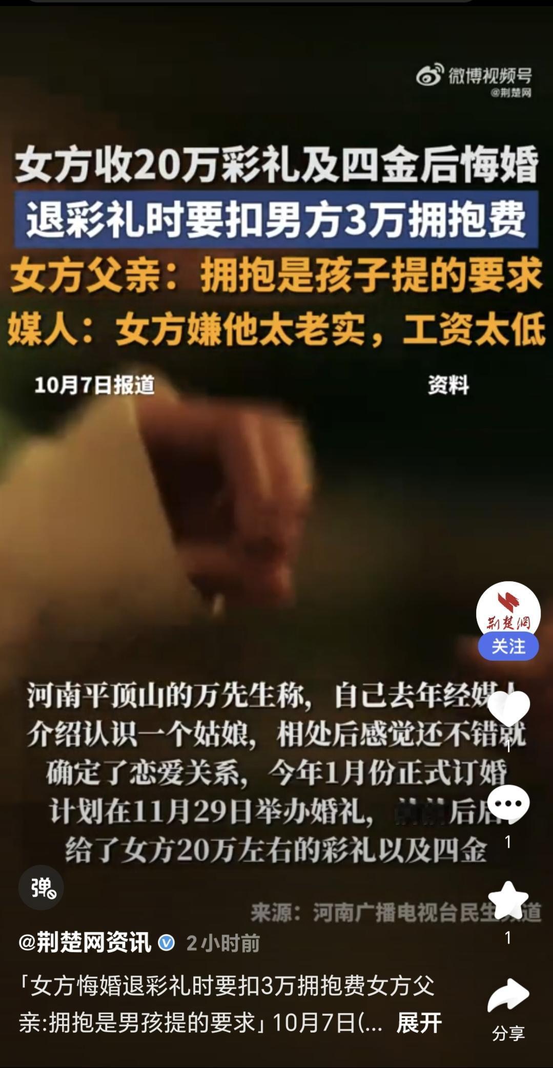 女方突然悔婚,退彩礼时扣3万拥抱费的样子,真丑! 河南平顶山一女子悔婚后退还20万彩礼时,以“被未婚夫拥抱过”为由扣除3万元,实际退还17万元,引发争议。 女方父亲称拥抱系男方要求,而媒人指责此举“缺德”,称从业70年首次遇到此类情况。 当事人介绍,双方去年经媒人介绍认识,于今年1月订婚,原本定于今年11月底举办婚礼,前前后后给了女方彩礼20万和四金。 商量退钱时,女方说拥抱扣3万。 女方回应,确实说过,拥抱费3万,其实涵盖了女方恋爱一年的花费。 媒人表示我说了1000多,对就这一对事多。 目前经过协商,双方达成一致,女方现场退还,170500元现金。 婚纱照也拍了,酒席也定了,亲友也通知了,现在女方突然说不结婚了,就是嫌男方挣得少。 原来3万的拥抱费,包含女方恋爱一年的花销啊。感情这女方谈恋爱是要一毛不拔,但凡出去吃饭,游玩等费用,必须男方买单。 男方是没有朋友,非要请你出去玩儿。 虽然笔者也是女性,但看到这样的事情,也忍不住要为这位准新郎打抱不平。 结了婚也可以离婚,订了婚当然也可以不结。不结婚却要扣男方彩礼费3万的,真是让人刷新三观。 结婚本也是男女双方的双向选择,女方当然可以,因为男方钱挣得少,选择不和那位男方结婚。 前提是要早说啊,等到彩礼给了,酒席定了,亲戚朋友通知了之后,临近婚期了,再说不结婚,确实是不地道。 更不地道的是,还有所谓的拥抱费,即使包含那样一年的花销。 如果觉得不满意,大可以尽早终止恋爱关系,那在恋爱期间的花销就没有那么多了。何苦要在恋爱期间花了钱之后,又决定不结婚了,再找男方把这钱报销回来。这吃干抹净的样子,太丑陋了。 恋爱,本是这世上男女双方从心动,倾慕,甜蜜相伴的美好经历。 经人介绍的相亲,少了一见倾心的心动,多了双方条件的衡量。男方的条件,更是经过介绍人的嘴,得以有了更大程度的了解。 从恋爱到决定走进婚姻,也应该是经过深思熟虑后的慎重选择。 不是一时冲动,头脑发热的草率决定。以至于男方竹篮打水一场空,还要被扣去一笔拥抱费。 希望男方在今后的相亲中能更顺利一些吧!不要再遇到这样缺乏契约精神,做事冲动,爱占便宜的女孩。 消息图片来源于,荆楚网资讯及荆楚网微博视频号 彩礼这些事 彩礼谈崩后 小伙被退婚