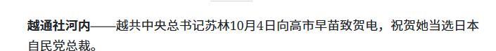 [微风]高市早苗当选为自民党新总裁,能不能当上首相还是两说,但越南领导人苏林已经先一步对其发出了贺电,对内容讳莫如深,和去年形成鲜明对比。高市刚在东京自民党大楼里赢得党内选举,河内这边苏林的信息就飞了过来,可有意思的是,这贺电的具体内容竟然成了谜团,这让不少人好奇:去年对石破茂可不是这么低调的。 回忆去年的情况,日本刚换领导人,石破茂成了自民党新任总裁,越南那边第一时间不仅送上贺电,还大大方方把祝福的话全都晒了出来,说多高兴多期待、希望和日本继续合作,外交辞令虽然官方,但该秀的诚意一点没少。 那时候日本媒体跟着报道,日越之间显得热乎乎的,大家都能感受到那种“我们是好伙伴”的信号。 但今年轮到高市早苗,越南依然给足了仪式感,不等日本国会表决首相人选,苏林就先下场,但这次河内的官方渠道只字不漏内容,单纯告诉大家“发了贺电”,全程保持神秘。 要不是紧盯东亚政局的朋友们,这一幕真是容易被忽略,大家都在猜:今年越南是不是有点不一样?难不成是因为高市的政治立场和形象,河内那边不敢像去年一样敞开心扉? 也有人认为,越南这一回未必是不在乎,而是想给对方一点压力。毕竟高市早苗的风格以保守著称,要是日本真往右倾,地区局势未必真能太平,越南当然要稳一手,贺电发了,但内容收着,既传递了重视,又不至于乱表态。 结合去年和今年的变化,越南这一套做法真有点讲究。换了主角,台词也跟着调整,去年是铺开说,强调友好与合作,今年则选择深藏不露,把主动权留在自己手里。 也许越南现在的想法是,伙伴关系稳住没问题,但还是留一点观察空间,看日本新领导人接下来的表现,不急着把话说满。 从越南的动作可以看得出,他们对日本的态度一直很用心。无论是谁上台,总能迅速作出回应,但面对不同的日本政坛人物,他们会灵活调整动作的力度和姿态。这一对比,挺有意思,也给日越关系添了点新鲜感。 总的来看,这次越南官方给高市早苗送祝福,继续保持了两国间的惯例互动,但把贺电细节藏起来,说不定也是给日本领导层提了个醒:合作没问题,但方向得对头。 接下来高市早苗要如何拿捏日本的对外姿态,越南显然还在观望。