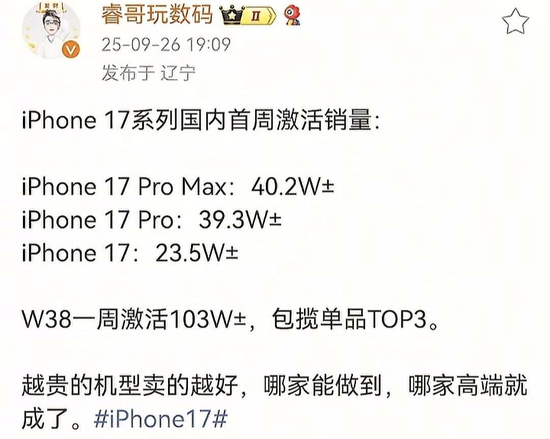 博主公布苹果17系列在我国一个星期的激活量,真是不看不知道,一看吓一跳,原本以为从四款新机变成三款后,销量会比去年同期低一些,没想到反而更猛,三款手机一个星期的激活量总和超过103万台,无敌是多么寂寞,要知道这可是6000起的手机,让其它品牌更扎心的是,网上都说大矩形后置相机设计丑,结果所谓的“太贵”、“太丑”的Pro系列销量更高,真是一个悲伤的故事啊,真是没有对比就没有伤害啊!