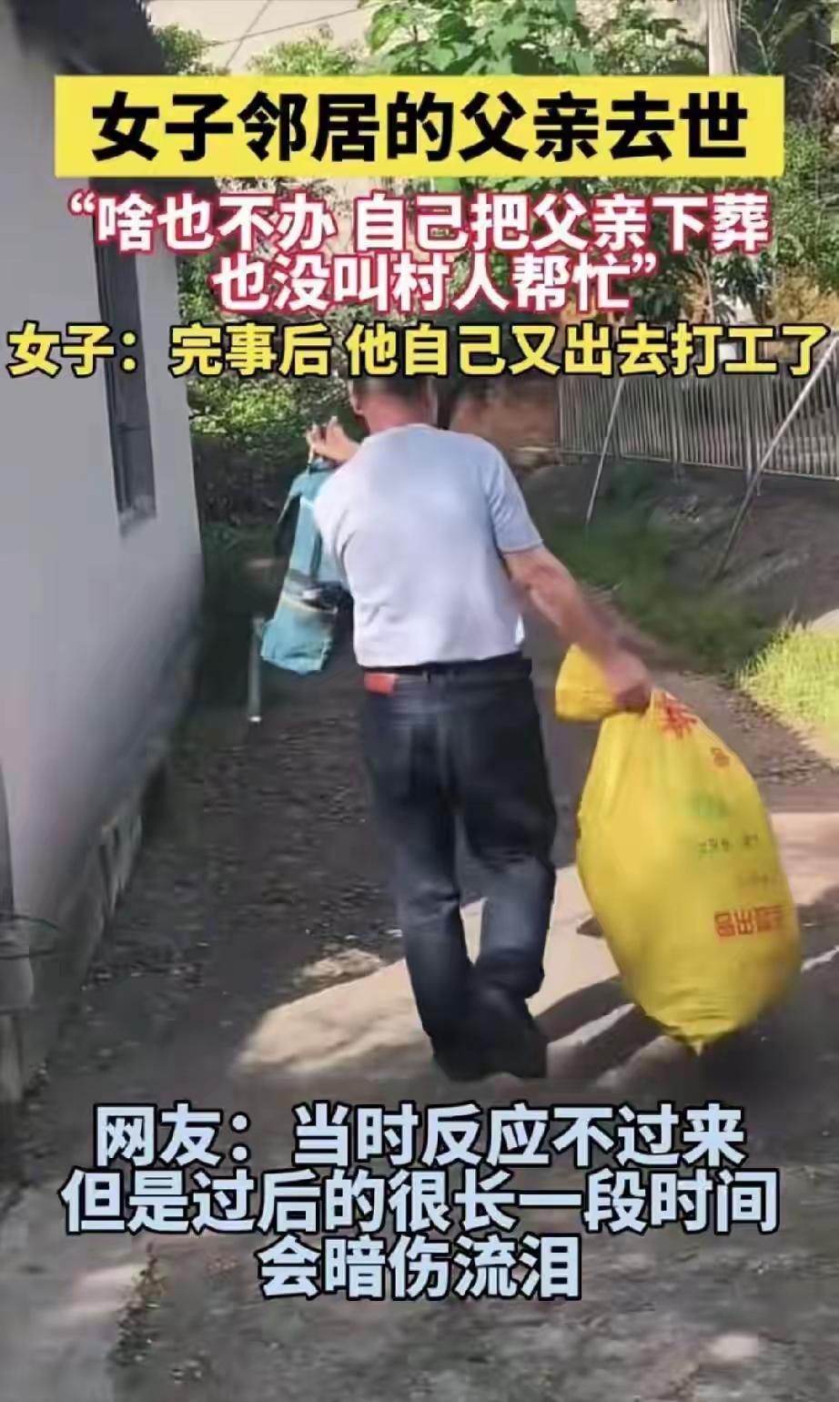 湖北农村一个老人过世,在武汉打工的儿子,回来之后一个人扛起老人的丧事,他没有通知任何亲戚朋友,一个人悄悄的办完了老父亲的身后事,忙完了之后又提着一个蛇皮袋子赶回武汉打工。 村里很多人事后才知道 老人过世已经办完了丧事 有一些人觉得老人的儿子不孝,父亲过世都没有办任何的仪式,不符合传统 有一些人觉得能理解老人的这个儿子,自己打了一份工,父亲常年有病,家庭经济不怎么好,丧事简办也是可以理解的。 对此,大家怎么看?