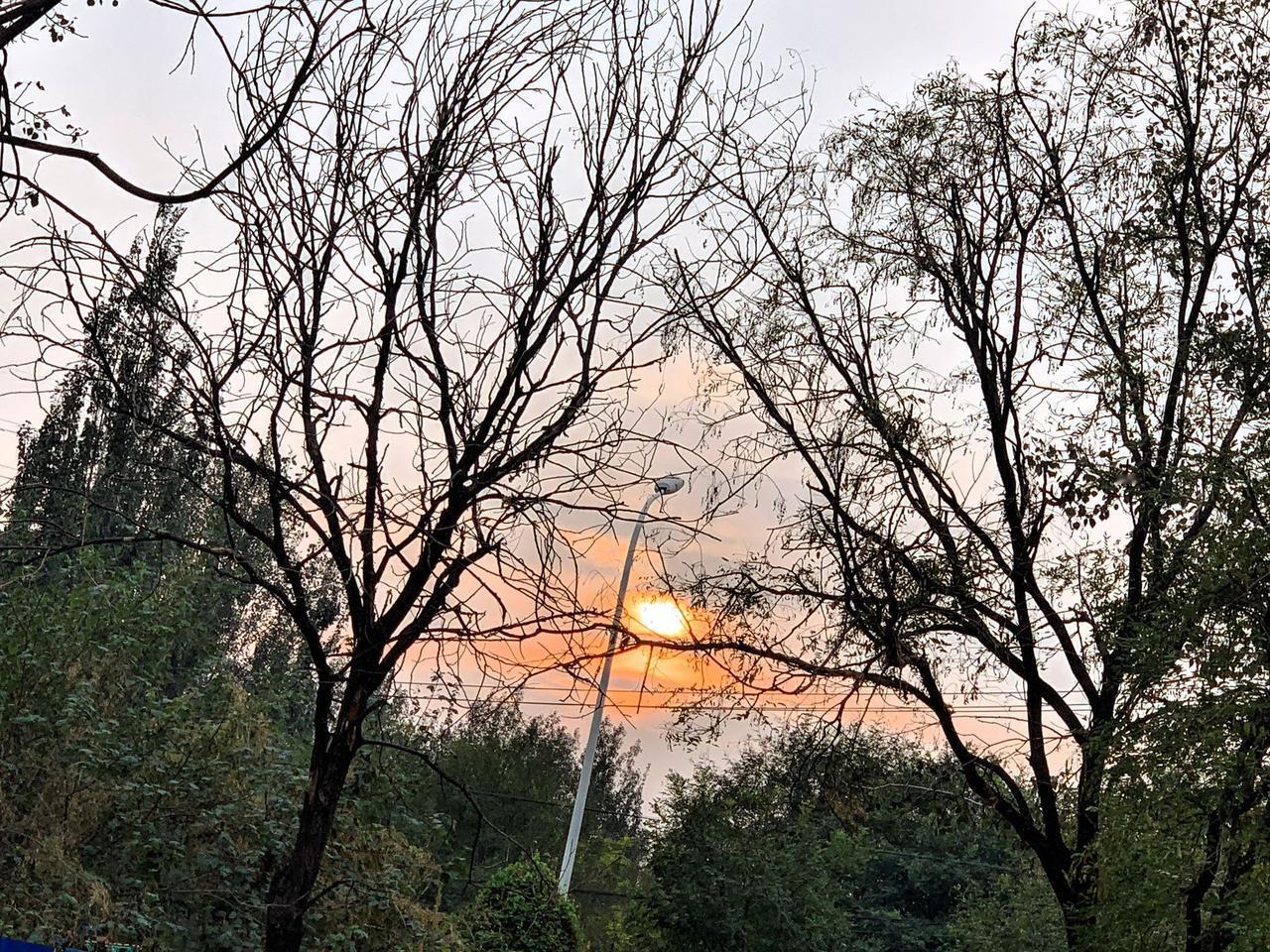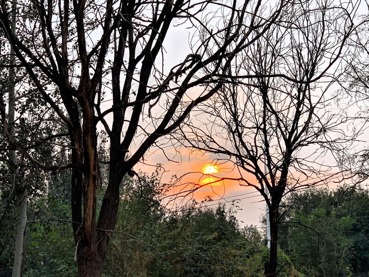 傍晚的天空被落日染成橘色,光秃的树枝在其间勾勒出疏朗的轮廓。那轮暖黄的太阳,像藏在自然画框里的光斑,把一天的疲惫都温柔消解。