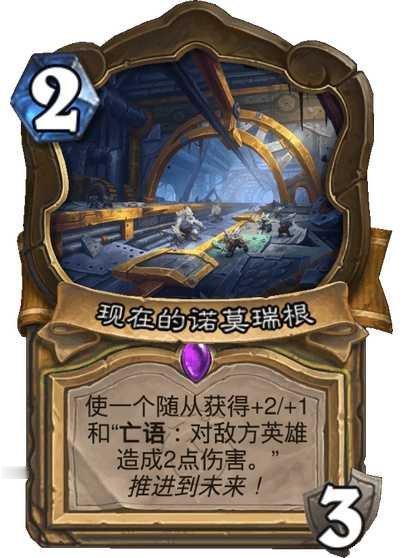 使一个随从获得+2/+1,并获得亡语“对敌方英雄造成2点伤害”,推进到未来