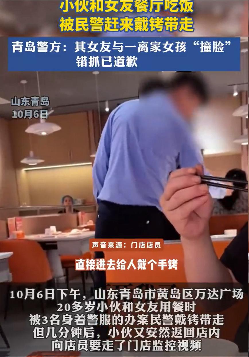 正和女友在餐厅吃饭呢,三副冰冷的手铐突然就铐在了手上,这事儿换谁身上不得吓懵?青