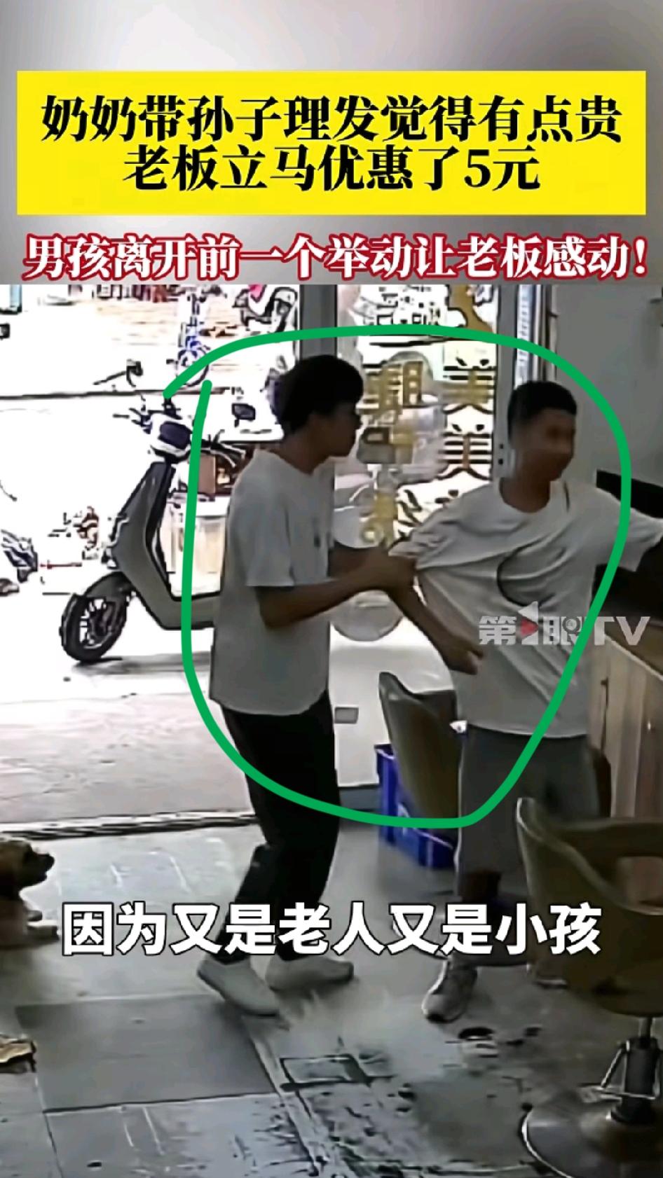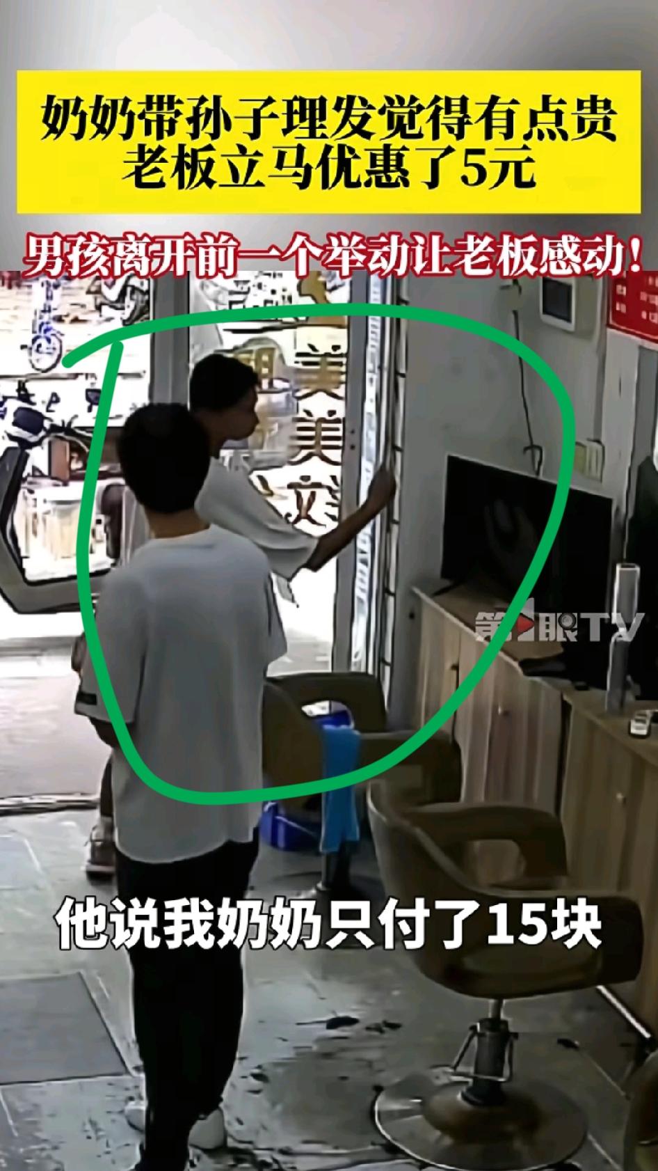 奶奶带孙子进店理发,老板说20块钱理一,奶奶觉得贵,转头要走,老板说便宜5块。奶奶让孙子理发,她去买菜。理完发,老板以为孙子就要走,没想到孙子掏出手机,准备扫码,告诉老板要把那5块钱补上。老板反手把小孩推出门,不让小孩扫码。 老人因为艰苦朴素了一辈子,深知赚钱的不容易,所以和老板讲价。老板因为尊老爱幼,内心善良,所以毫不犹豫的给老人优惠了5块钱。最让人感到欣慰的是这个孩子,他不因为奶奶和老板讲价而感到羞愧难当,没有当面发泄对奶奶的不满,而是看着奶奶和老板讲价然后接受并理发。当奶奶走了以后,他内心觉得对不起老板,决定补上5块的差价。这个孩子,他理解奶奶对自己的爱,理解老板赚钱的不容易,是一个孝顺、善良、懂得站在他人的角度考虑问题的人,将来一定有大作为!