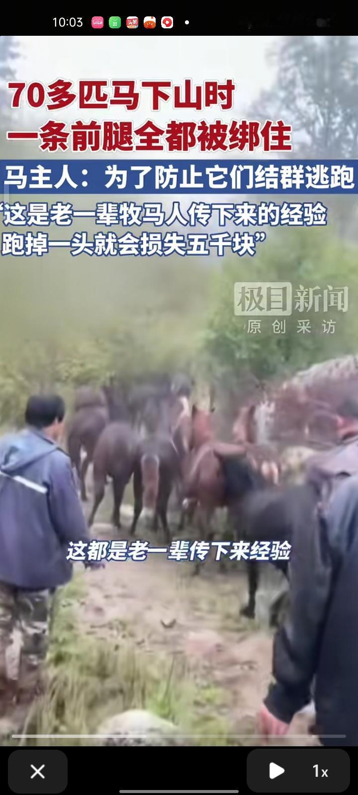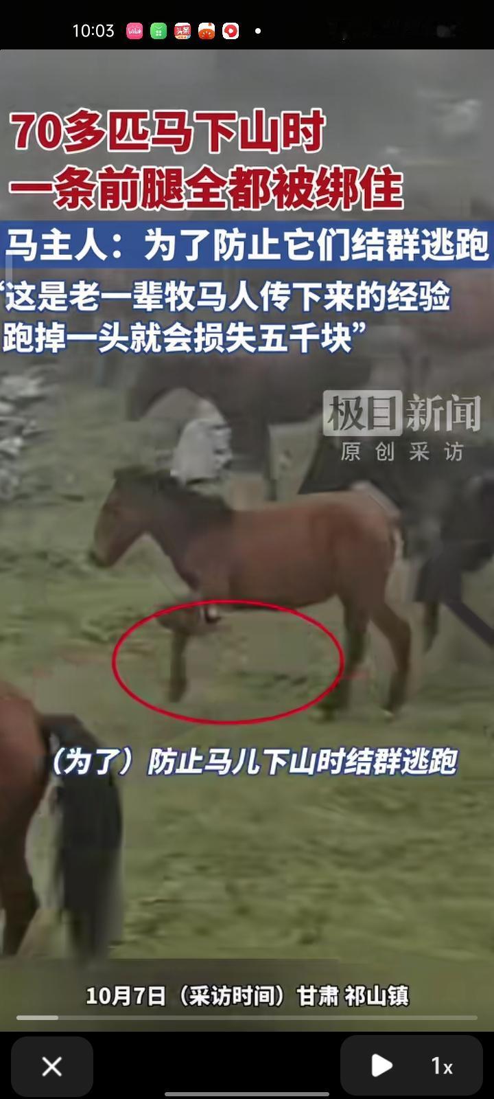 10月4日,陇南市礼县。70多匹马下山时,一条前腿全被绑住。马主人介绍称,目前一匹马市场价5000元,为防止马儿下山后结群逃跑难寻找,所以才给所有马儿都绑了一条前腿,这是老一辈牧马人传下来的经验。 对于网友担心绑腿可能对马儿造成伤害的问题,马主人表示,由于路程不远,到达目的地后就会解开绑腿,因此不会对马儿造成太大影响。 然而,这种做法也存在明显弊端。马是四肢支撑动物,单腿被绑会破坏自然步态,下山时更容易滑倒、摔伤,尤其在湿滑或崎岖地形风险更高。而且长时间绑腿可能造成血液循环障碍、神经损伤。所以,最好的办法是,在下山口设置临时围栏和分群管理。
