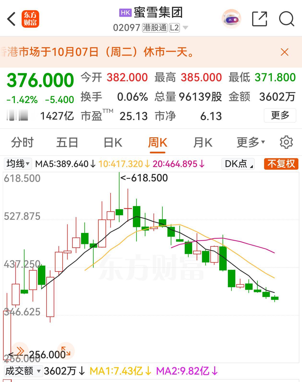 新新消费故事讲完了,蜜雪集团股价熄火,高点下来超过40了%,追高的投资者在山顶凌