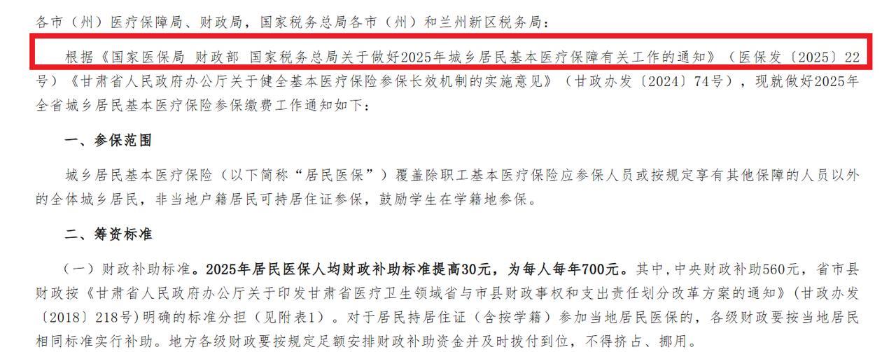定了!2026年度城乡居民医保缴费标准不变,还是400元!及时告知亲友。 2026年度城乡居民医保缴费已经开始,关于个人缴费标准,现在也定下来了,仍然为400元,没有涨钱,这也是居民医保缴费以来,首次没有涨价的情况,无疑是一个好消息。 我们看到国家医保局没有公布正式的文件,但是根据甘肃等地的通知,都提到缴费金额是根据“《国家医保局 财政部 国家税务总局关于做好2025年城乡居民基本医疗保障有关工作的通知》(医保发〔2025〕22号)”来确定的,也就是说文件其实已经下发到了各地医保局了。 根据甘肃的缴费标准,其中财政补贴部分为700元,上涨了30元,而个人缴费金额为400元,跟去年保持一致。 按照惯例,大多数地方的医保集中缴费期会在12月底以前结束,也就是还有三个月的时间,大家需要注意缴费期限,不要错过缴费,因为从2025年开始,如果没有在集中参保期内参保的,会有待遇等待期,时间为3个月。 正常来说,成年居民,无论年龄多大,都是需要每年缴纳城乡居民医保的,不过一些地方也会有优待,属于特殊群体的,可以享受到减免。我们还是以甘肃为例,属于特困人员的,个人无需缴费,可以获得全额资助,属于农村低保一二类的,可以获得部分资助,个人只需缴纳90元而不是400元。