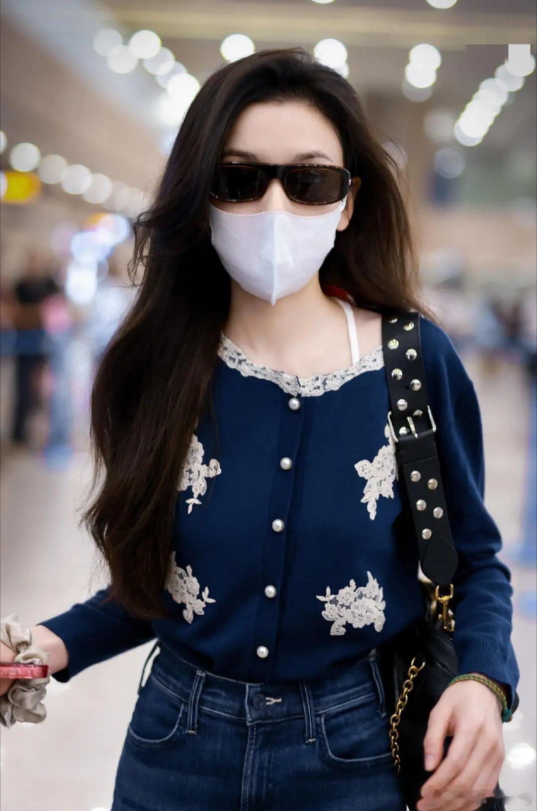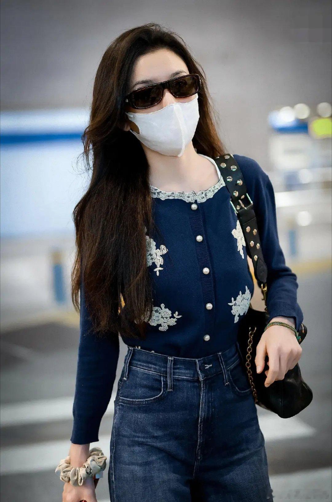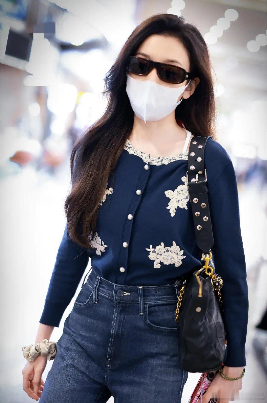 宋祖儿回国机场路透,穿蓝色绣花针织衫搭配阔腿牛仔裤,又美又飒​​​