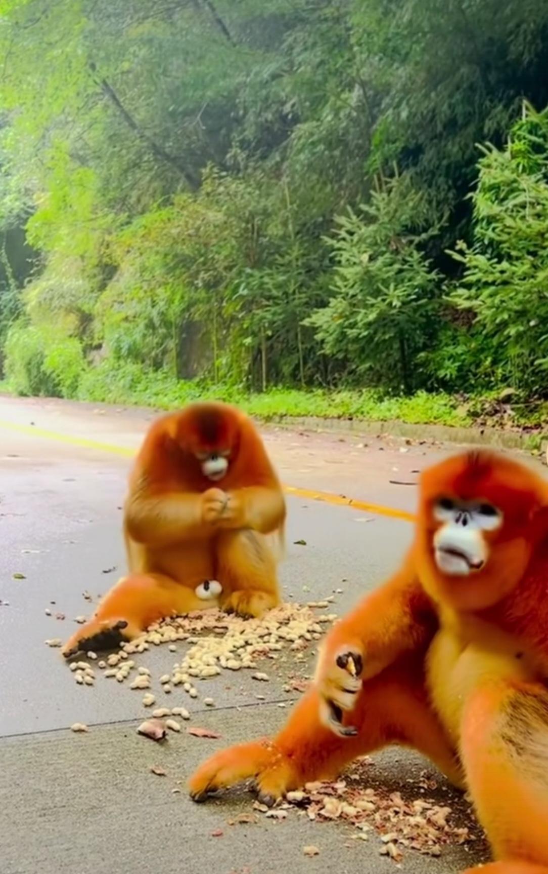 景区里,两只金丝猴坐在地上吃花生,它们不紧不慢的把花生壳剥开塞入嘴里,然后就抬头