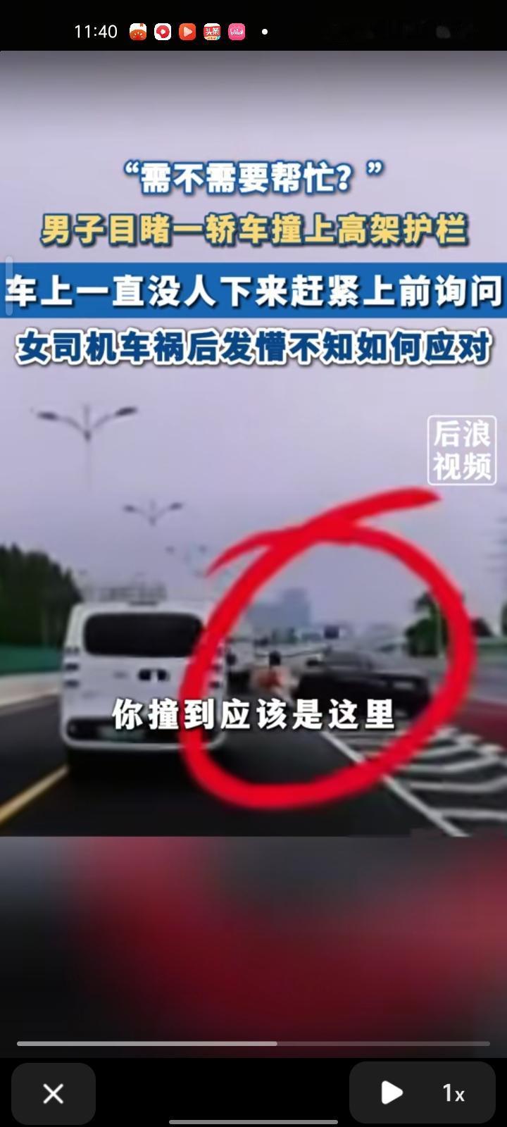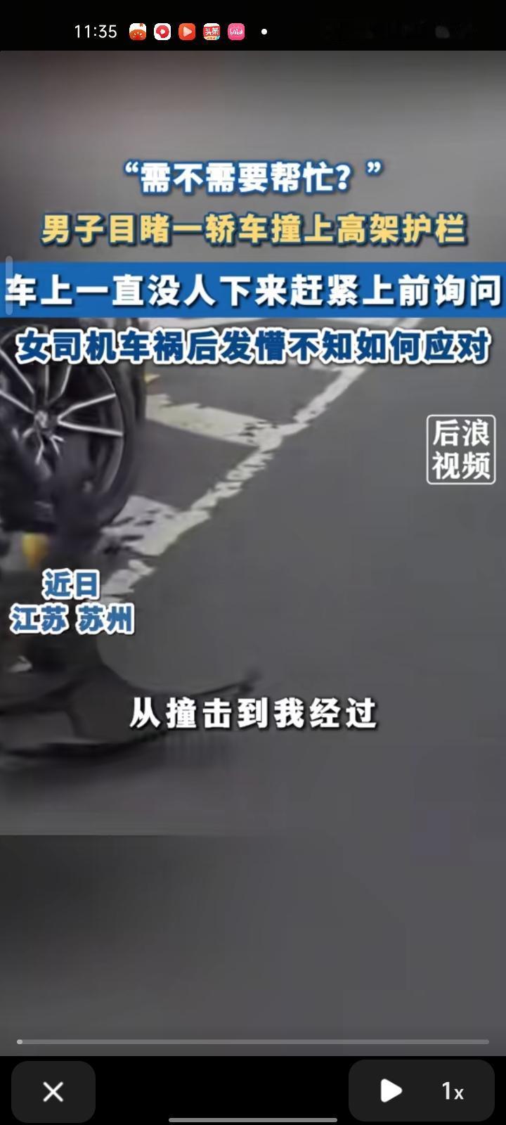 10月3日,江苏苏州。男子看到一辆轿车撞上高架护栏,车上一直没人下来就上前询问。打开一看,女车主像没事人一样,还在想着要不要把车子停在路边,完全没意识到自己的车损坏开不了。随后,男子叫女车主打电话联系家人来处理这件事情,然后离开。