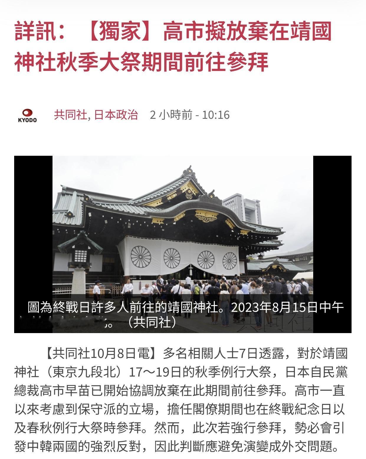 共同社:传高市早苗为避免外交风波正考虑不到靖国神社参拜 日本共同社10月8日电