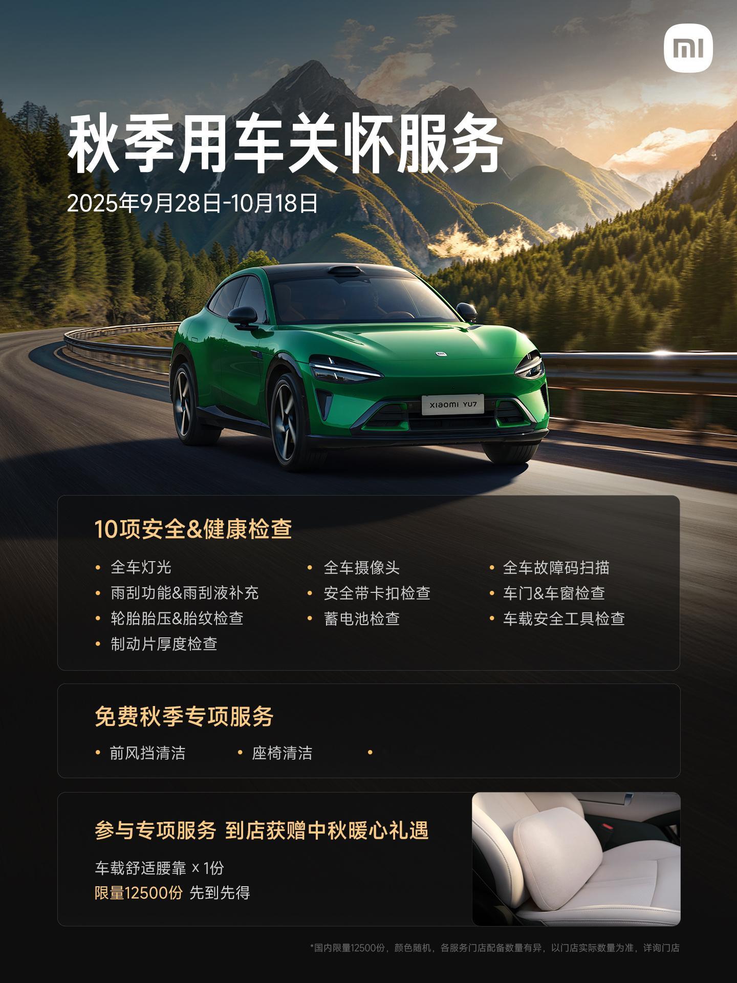 第二个服务就是秋季用车关怀服务,从9月28日开始,10月18日结束。如果你车子多,小米汽车停你家车库很久不开了,那你可以在出行前开去售后整备,以便出行无忧;或者说你经历了国庆数天的长途跋涉,那你也可以在18号之前把车送到售后检修和清洁。运气好了说不定还能白嫖一个靠枕。