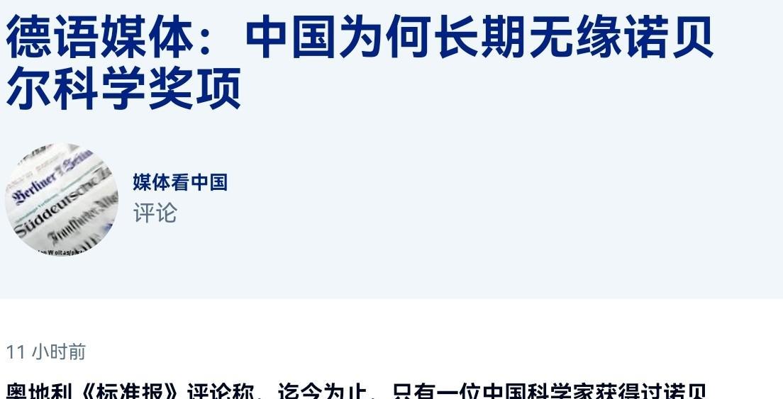 罕见!在中国科学家再次无缘诺贝尔最高奖项之后,德媒表示,以诺奖看待中国,这是对中