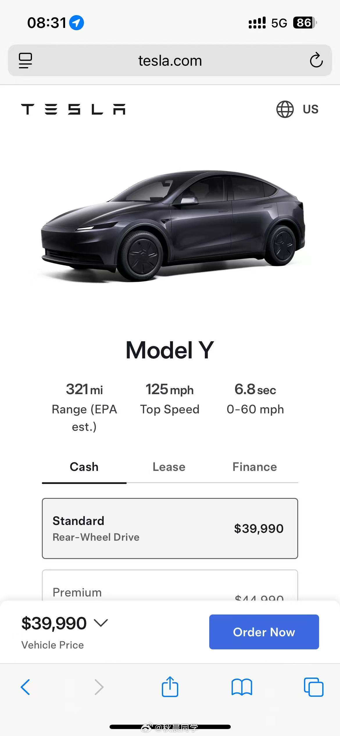 Standard Model Y售价$39990(约28.48万人民币),比之前便宜了$5000。